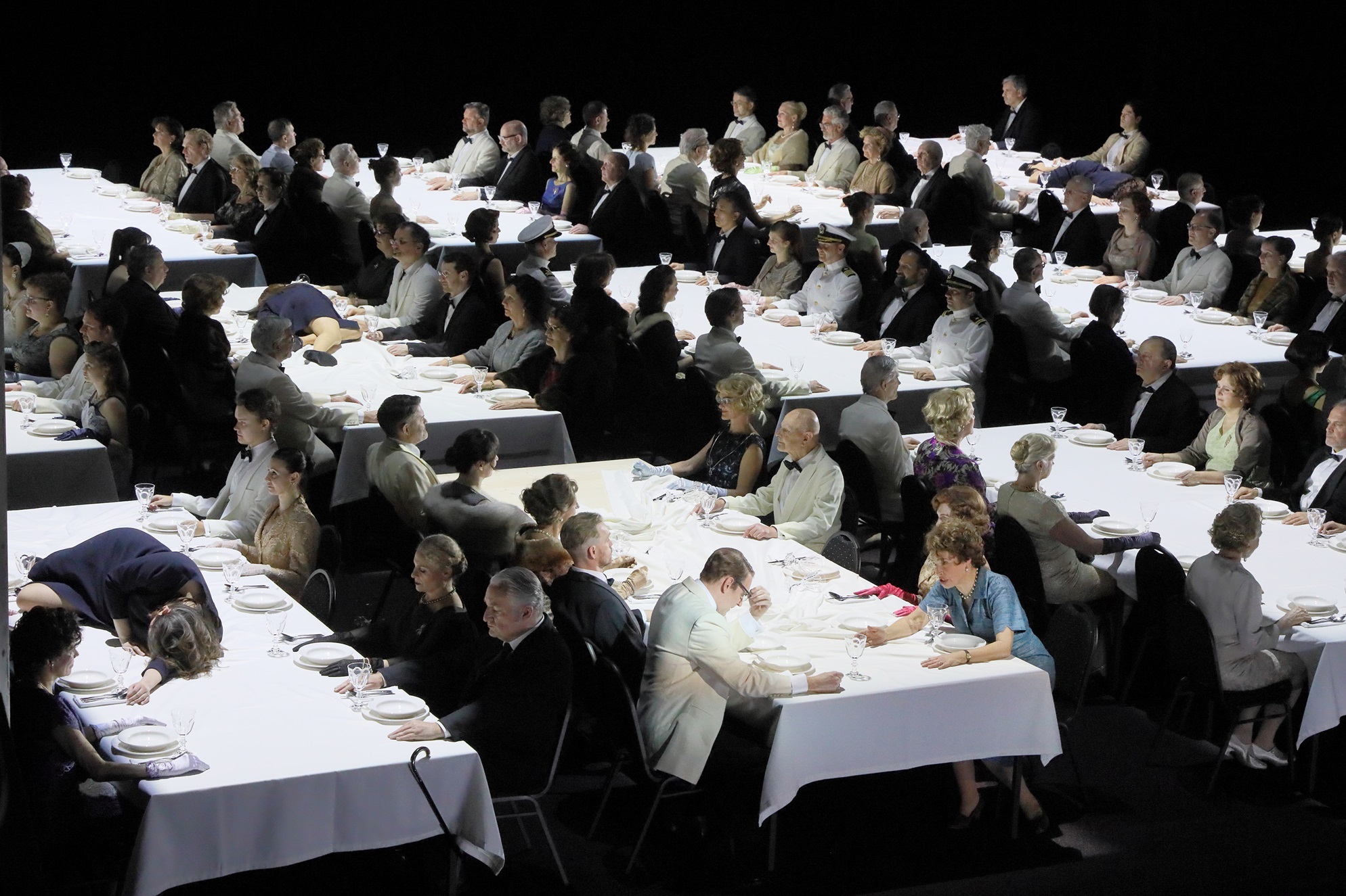 La deuxième partie, elle, est présentée dans la salle à manger du bateau, avec ses longues tables disposées sur toute la scène ; la sobre dignité de la première partie perd ici en densité, en partie à cause de la partition (la musique de danse dont Weinberg abuse en fond sonore), mais surtout à cause de la mise en scène, qui fait l'erreur fatale de vouloir montrer directement la violence – les tortionnaires passent entre les tables en les frappant comme avec des matraques : c'est dérisoire, et cela montre bien les apories propres à l'œuvre, que Kratzer et Jurowski ont bien perçu sans pouvoir les surmonter. Jurowski, du moins, mérite toute notre reconnaissance pour sa direction d'une absolue sobriété, qui donne poids et gravité à la partition en l'expurgeant autant que faire se peut de ses tendances sentimentales. Il fait travailler l'ensemble de la distribution dans le même sens : Sophie Koch chante Lisa, le rôle le plus problématique de l'œuvre, avec un peu trop d'énergie théâtrale, mais Elena Tsallagova en Marta évite heureusement toute victimisation, et son chant radieux donne un peu de vie au rôle. Parmi les autres rôles des scènes de camp, on remarque d'abord Larissa Diadkova, la plus grande des mezzos slaves de ces dernières décennies, particulièrement émouvante ; les hommes, eux, Charles Workman comme Jacques Imbrailo, sont efficaces et musicaux, mais l'opéra ne leur fait guère faire que de la figuration.