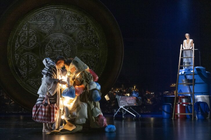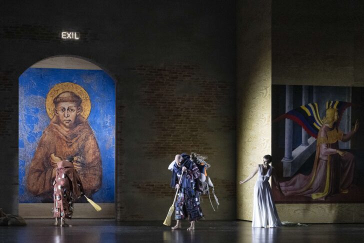 L'œuvre présuppose une mise en scène capable de captiver un auditoire pendant quatre heures et demie de musique. Or, dans le cas d'espèce, d'avoir donné à un plasticien, aussi mondialement connu soit-il, le soin de nous raconter ces scènes où l'action est quasi inexistante et le dialogue rare et éthéré apparait comme une erreur manifeste. C'est avec de l'esprit qu'il faut habiter ces scènes, pas avec des gadgets. Or, Abdel Abdessemed nous gave d'images incompatibles avec la spiritualité des personnages. Sinon, que viennent faire ces vidéos de robots humanoïdes écrasant du raisin ? Quelle justification à ce hammam ? Et ce dromadaire lifté du plateau jusqu'aux cintres ? Et ces tapis pendus pendant quelques minutes au-dessus de la scène ? Que dire encore de ce gigantesque pigeon de plâtre trônant au sommet de ce qui pourrait être une montagne de fiente ? Et de cette église grise occupant toute la scène, tristement éclairée, bientôt dégoulinante de suies, dont un seul angle permet à Saint François de se déshabiller pour recevoir les stigmates (qu'on ne distingue d'ailleurs pas !) ? Et ces caddies de supermarché ? Tant d'objets, de décors qui occupent l'espace sans qu'ils ne servent à quoi que ce soit. Quant aux costumes, encombrants et encombrés, en lieu et place de simple toge de bure, on a trouvé judicieux de coudre dessus des circuits imprimés, des carcasses de téléphones portable, divers éléments d'électroniques. On a même poussé le détail à mettre une pile pour permettre à l'un de ces éléments de s'illuminer brièvement ! Et pour peut-être souligner que chacun des protagonistes trimballe son bagage humain, on a prit soin de coudre au dos des toges nombre de coussins, de sacs plastiques. Quant au lépreux, on ne pouvait lui attribuer qu'une cape couverte de sacs plastiques et d'une corolle de lampes illustrant avec humour (?) sa fièvre bubonique. Seule l'Ange était immaculée dans sa robe blanche et, afin qu'on ne se méprenne pas sur ses intentions, elle tient ses ailes colorées au bout de ses mains.