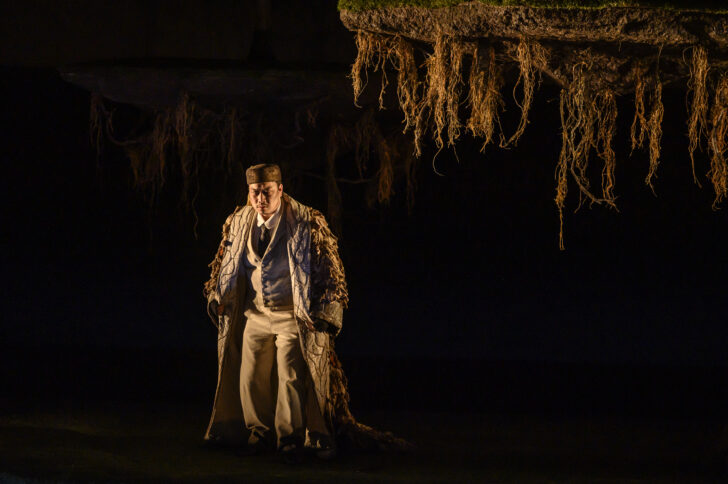 « Nous ne voyons que l'envers des choses » écrivait Maurice Maeterlinck, l'auteur symboliste de la pièce de théâtre quasi intégralement devenue le livret de l'unique opéra achevé par Claude Debussy. C'est pourtant sous l'égide des apparences, et sous des influences picturales multiples, que Barbe et Doucet ont voulu placer « leur » Pelléas à la fois maritime et végétal. Dans leur court texte d'intentions joint au programme, les metteurs en scène – signant par ailleurs dramaturgie, décors et costumes – parfois assez décalés, tel ce manteau de mandarin ceignant un roi Arkel boiteux – entendent placer leur vision de l'œuvre sous la prescience du spiritisme, et proposer visuellement, sous les éclairages volontairement très sombres de Guy Simard, « une libre réinterprétation » de l'île des Morts, la série de tableaux symbolistes d'Arnold Böcklin. Certes l'omniprésence – outre celle de la Camarde – de l'élément liquide (depuis l'étang forestier de la rencontre initiale entre Golaud et Mélisande à la Mer menaçante en passant par la Fontaine des Aveugles) justifie certains partis-pris, tel le plan d'eau vaporeux disposé en bord de scène, ou la suggestion abstraite de grottes ou des souterrains humides, au fil de l'action, sous les perspectives infinies de lointaines coursives, ou plus encore l'espace central très géométrique, sorte de ligne de partage des eaux entre frères rivaux.