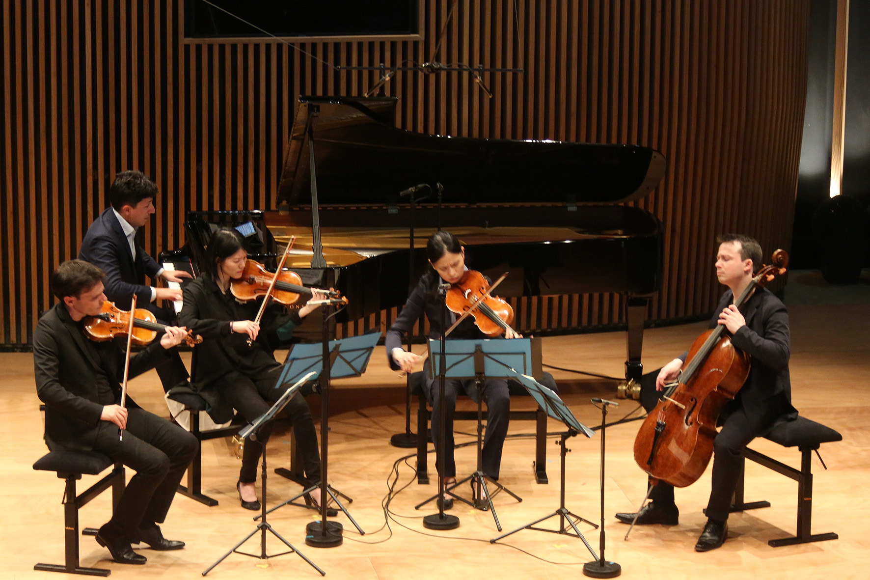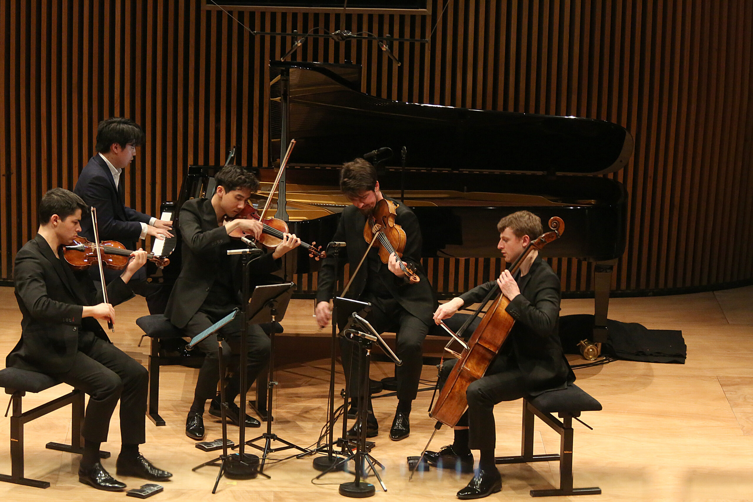 Le lendemain, c'est au tour du Quatuor Hermès d'entrer en scène, pour un concert initié par un Langsamer Satz de Webern d'une grande finesse, qui démontre par la sonorité chaude des instrumentistes comme ils s'accordent idéalement à la musique post-romantique. Une fois l'œuvre achevée, les musiciens reviennent avec Ismaël Margain pour une intéressante rareté, puisqu'il s'agît de la version pour quatuor à cordes et piano du Concerto n° 13 K.415 de Mozart, écrite de sa propre main en complément de la version plus célèbre pour petit ensemble à cordes et vents. Ici, les Hermès s'adaptent peut-être un peu moins au phrasé classique que les Arod la veille, mais le fait qu'on ne soit pas dans un pur quintette, mais bien dans un concerto avec quatuor, permet de profiter de leur volume pour compenser ce que l'oreille cherche à retrouver de la version avec orchestre de chambre. Plus évident par sa souplesse et son cantabile, le pianiste livre sa partie avec énergie, jamais en décalage avec le groupe, bien que son Steinway soit placé derrière plutôt que devant les autres musiciens.