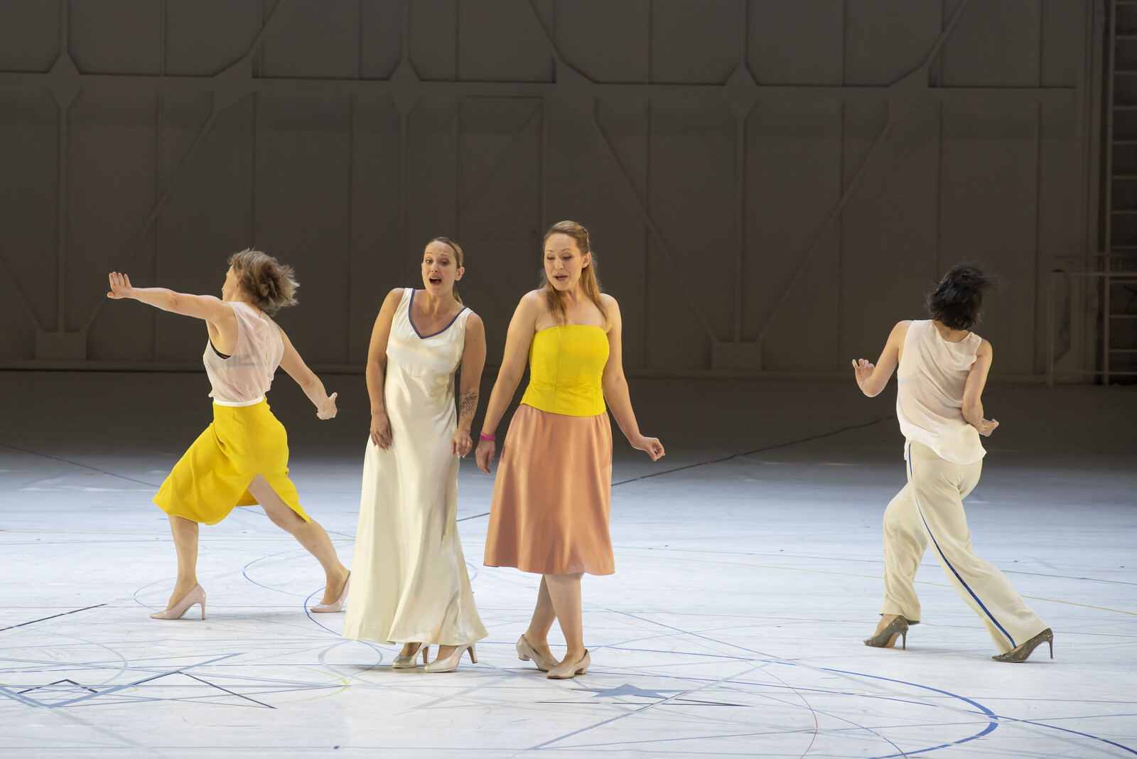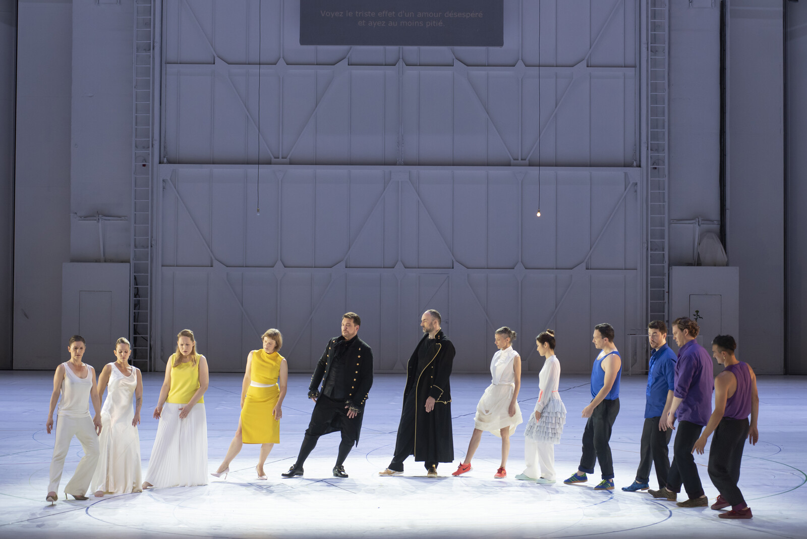 Dans un plateau presque vide, et entièrement peint en blanc, délimitée par quelques panneaux de plexiglas encadrés de blanc, la chorégraphie alterne entre spirale et volutes tournées vers le ciel et travail au sol, fait de roulades et d’équilibres. Anne Teresa De Keersmaeker utilise la vastitude du plateau de Garnier, faisant courir et disparaître ses personnages vers l’arrière-scène. Aucun accessoire ne trouble le regard ni n’entrave l’action. Dans une palette de costumes de mousseline et satin blanc, jaune fluo ou couleur blush, chanteuses, chanteurs, danseuses et danseurs sont à l’unisson et dans une complicité parfaite.