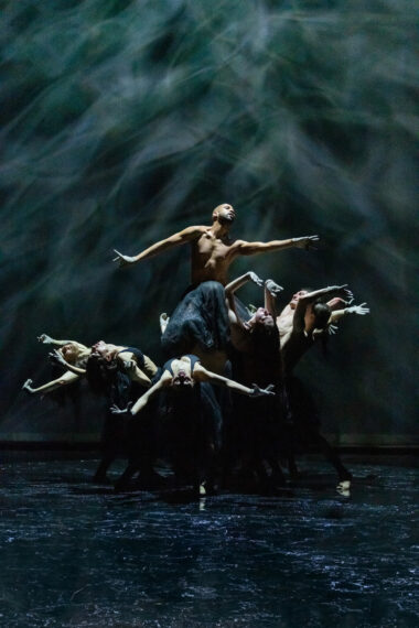 Exit l'image de l'orchestre, du chœur, des solistes, du chef. Des « Arts Flo » ne subsiste que le son : un enregistrement réalisé en 2023 au Gran Teatre del Liceu de Barcelone. C'est dorénavant seule à la barre que Blanca Li entend déployer les sortilèges en toute liberté de son art spécifique. Dès le Prologue, œil et oreille sont immédiatement captés par la fantaisie joueuse d'un orchestre imaginaire recréé par des danseurs sans instruments. À voir s'éclater sous la douche d'un petit rectangle de lumière ces serpents de chair et d'os littéralement possédés par la musique de l'Orpheus Britannicus, on oublie d'emblée l'absence d'un véritable orchestre en fosse, allant même jusqu'à croire que cordes et flûtes sont bien présents sur scène, et que ce sont les danseurs qui jouent l'ode Celestial Music did the Gods inspire Z 222 venue ressusciter le Prologue perdu de l'opéra. Le rectangle lumineux s'allonge ensuite jusqu'à ce qu'avant l'Ouverture de l'opéra proprement dit, on distingue dans la pénombre les allées et venues de danseurs construisant à vue leur futur terrain de jeu : une manière de tapis de danse liquide recréant le décor d'une Enéide qui raconta comment, après la Guerre de Troie, et après avoir erré en Méditerranée, Enée échoua sur la plage de Carthage. Dans cette logique marine, les danseurs tombent peu à peu, qui la veste, qui le pantalon, qui le kilt : les amours de Didon et Enée se joueront en maillot de bain. Noir, bien sûr. C'est une tragédie.
