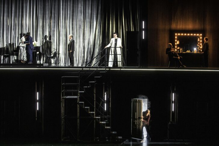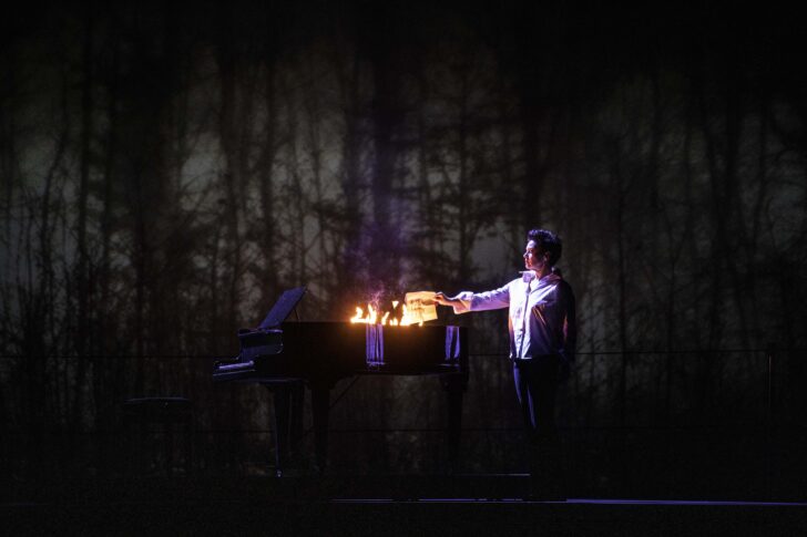 En abattant d'abord le quatrième mur, Richard Brunel capte immédiatement l'attention de son spectateur : les applaudissements qui saluent l'entrée du chef en fosse accueillent aussi la Diva qui s'apprête à un récital qu'elle ne donnera pas, la première note du Prélude la faisant s'écrouler devant son pianiste et sa tourneuse de pages, la jeune Krista. Le décor classieux de Bruno de Lavenère (un intérieur cossu qui pourra faire fonction d'étude notariale, de théâtre, de château hanté avec ses deux étages et son mobilier mobile) se met alors en mouvement au gré de la narration. Pédagogue avant tout (d'abord désopacifier la tortueuse généalogie notariée de l'Acte I), la mise en scène navigue entre le prosaïsme d'un tableau d'école primaire, d'une maquette, et le surgissement onirique de fumigènes ondoyant derrière des portes aux apparitions. Surligné de néons un peu sous-employés (celui du ras du sol aurait fait merveille au moment de la passation de pouvoir finale, pas immédiatement déchiffrable), l'ensemble affiche élégance et mystère jusqu'à l'irruption bienvenue d'une Nature faisant voler en éclats ce cadre confiné. C'est devant un panorama sylvestre que la Marty peut procéder à la consumation de la formule Makropoulos dans un piano en feu. Une diva va s'éteindre. Une autre va naître. La Tosca imaginée par Christophe Honoré à Aix-en-Provence puis à Lyon ne racontait pas autre chose : le baume de la transmission apposé sur la douleur de la disparition.