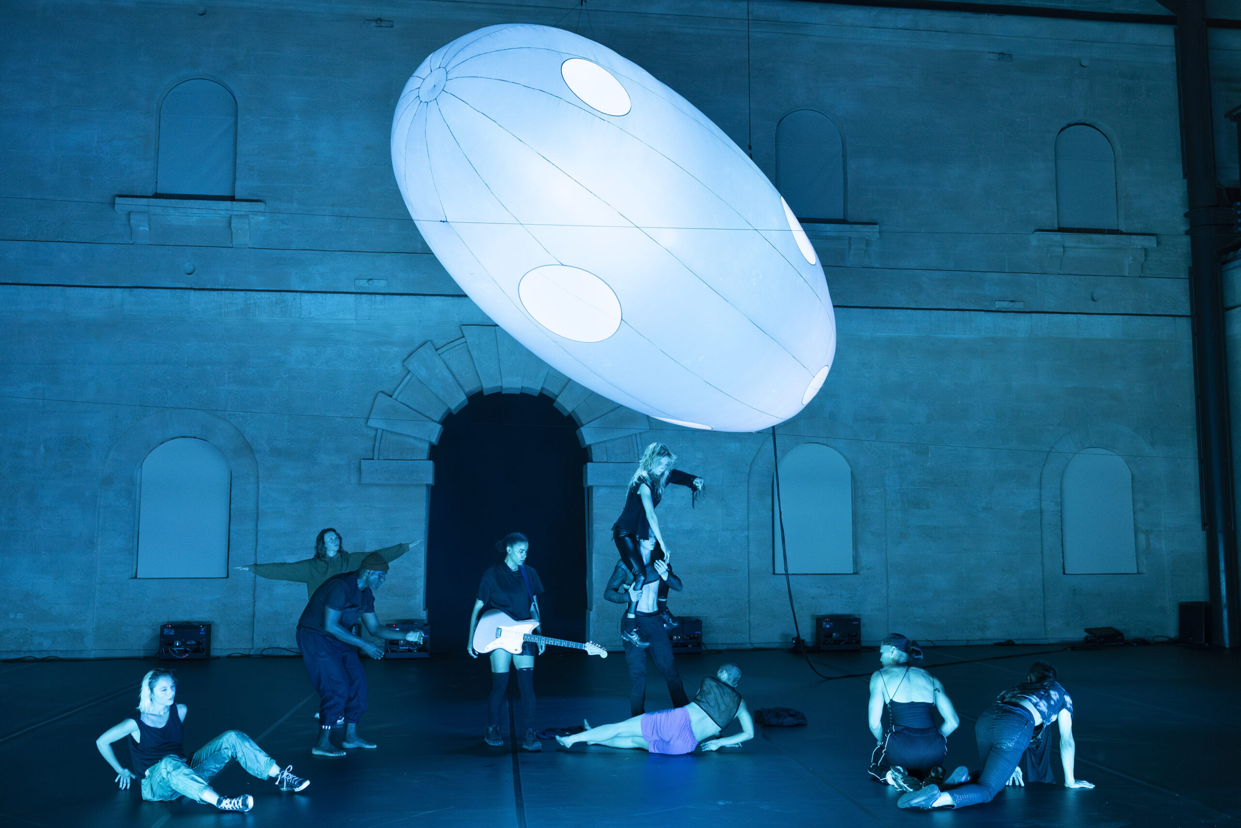 Arrivée en plein air, dans le très beau Théâtre de l'Agora avec sa forme circulaire et aérienne. Aérienne, comme la forme qui repose au sol, telle une grosse baleine échouée, qui s'avère l'enveloppe d'un ballon dirigeable s'élevant doucement dans le ciel et s'éclairant de multiples couleurs au fil du spectacle. Au sol, des danseurs venus de la salle et immobiles, emmenés ensuite parmi le public, puisqu'ils sont de simples spectateurs. Place alors aux neuf danseurs de la troupe au fil de formes qui semblent être souvent venues d'improvisations personnelles, et d'une vivacité toute américaine. Pas surprenant, puisque Dimitri Chamblas, le chorégraphe français, jongle désormais entre la France et une vie essentiellement californienne, même si cette création est aussi le fruit d'une résidence d'artiste à Montpellier.