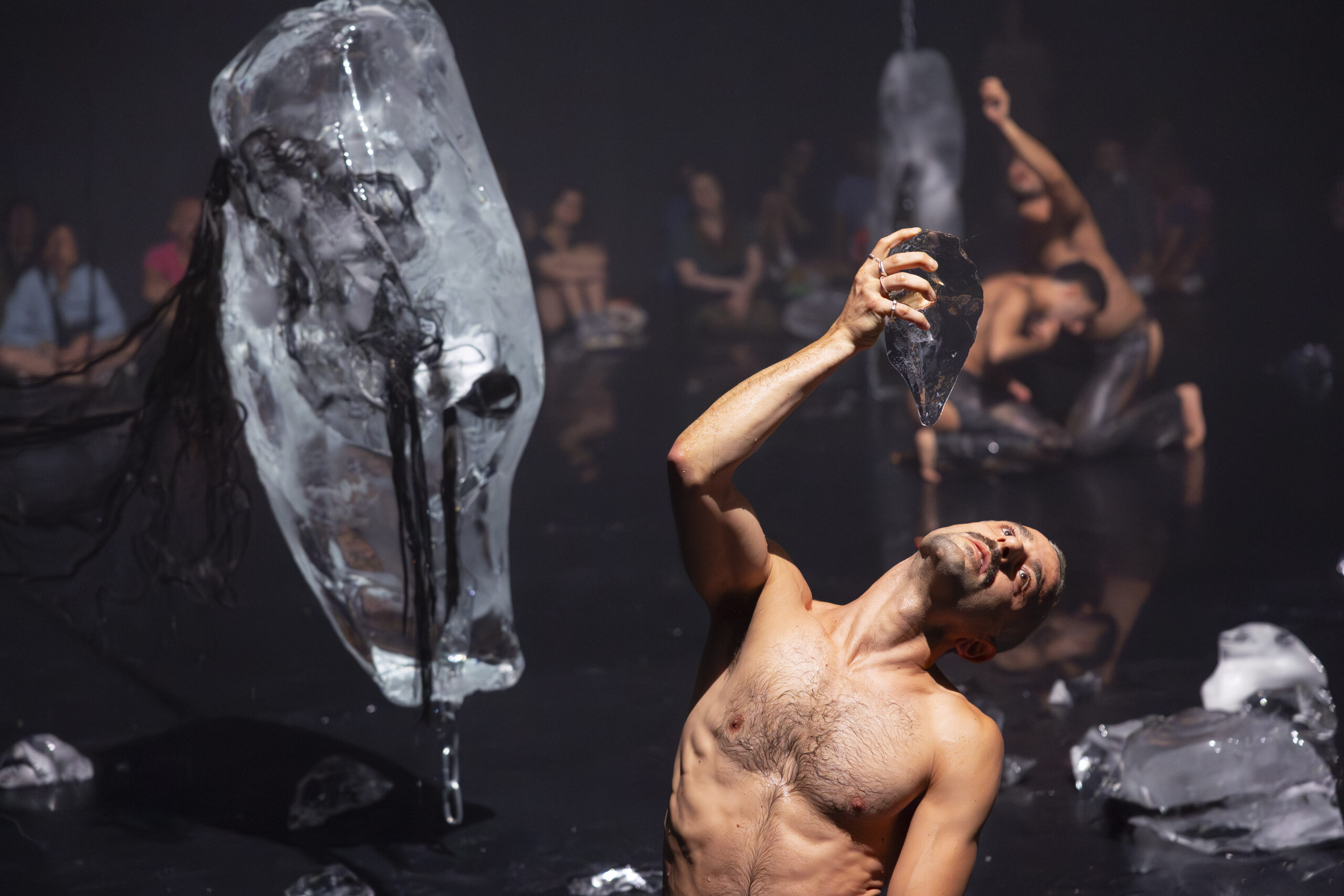 Il y a le propos et il y a le contexte. Pénétrer l'univers de Sorour Darabi, jeune performeur iranien désormais installé à Paris et qui explore le monde trans, c'est en éprouver les joies et les douleurs. Entrés dans le noir, nous voilà sommés de chercher un siège qui n'existe pas : ici, le séant, c'est le sol. On sera donc assis par terre pendant deux heures, ou debout selon ses envies et ses capacités. À chacun sa forme de supplice, semble nous dire le chorégraphe et performeur. Son univers visuel est détonnant : trois énormes formes pendant au bout d'un croc de boucher semblent être quelques carcasses de viande. La lumière arrivant, on découvre qu'il s'agit en réalité de pains de glace, dont on se demande en combien de temps ils vont fondre sur le linoleum. Ils resteront bien en place, mais l'eau glacée dégoulinant au sol sera vite source de jeux pour les six danseurs, dans une évidente citation aux nombreuses créations aquatiques de Pina Bausch.