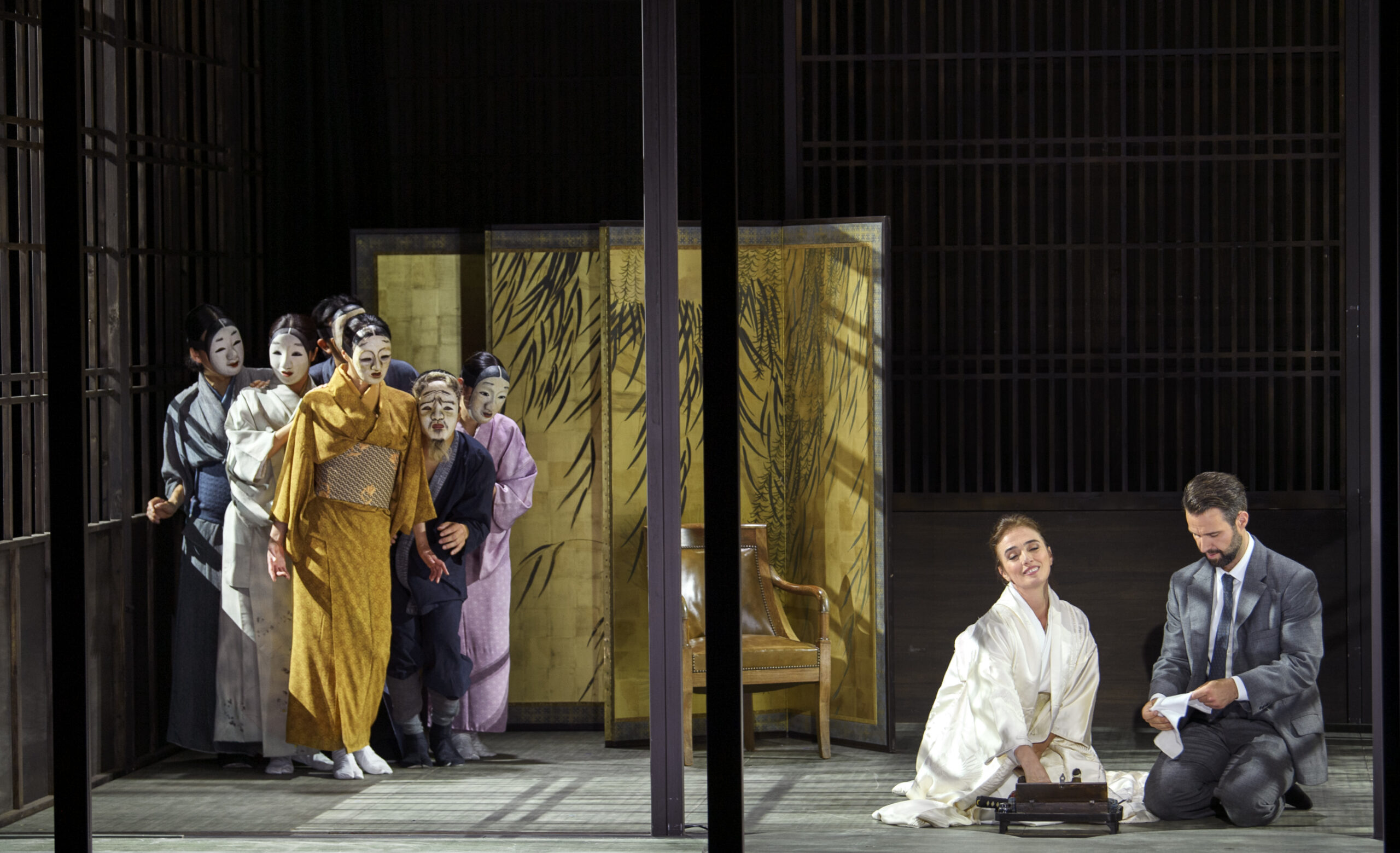 À ses côtés le Pinkerton très fort en voix d'Adam Smith, visiblement très heureux d'être là, n'aura pas fait montre d'autant de subtilité vocale, mais peut-on demander autre chose à ce personnage en tous points détestable, aussi séduisant et solaire fût-il. Lionel Lhote, d'une sincère noblesse contenue, peut ajouter sans problème Sharpless à son déjà glorieux répertoire. Cauteleux à souhait, Carlo Bosi expose à nouveau ce Goro qu'aucun metteur en scène n'a encore eu envie de sauver. Ce qui n'est pas le cas de la Kate émouvante d'Albane Carrère à qui Andrea Breth offre une conséquente présence scénique. Il en va de même pour la Suzuki étrangement froide de Mihoko Fujimura dont l'imposant galbe sombre dessine les contours de ce qui pourrait être une fausse suivante (on la voit clairement comploter avec Goro). Le Bonze d'Inho Jeong, le Yamadori de Kristofer Lundin… tous les comprimarii sont judicieusement distribués. Le chœur de l'Opéra de Lyon, invisibilisé de noir par Breth dans la pénombre qui enveloppe le dispositif, enchante, particulièrement au moment du si difficile numéro à bouche fermé de l'Acte II.