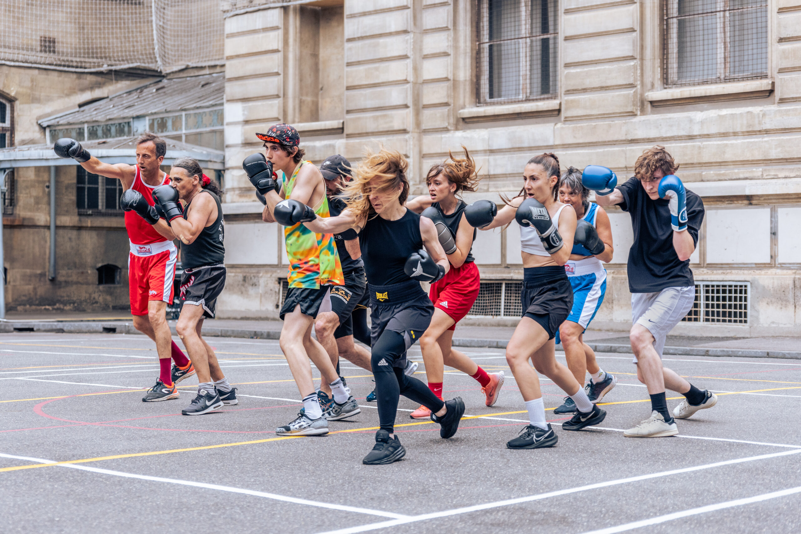 En première partie de soirée, dans le cadre de l'Olympiade culturelle, a mis en mouvement 40 sportifs amateurs pour Podium, commande du festival Paris l'été. Boxe, gymnastique rythmique et sportive et aérobic, ce sont les trois disciplines sportives qu' a choisi de valoriser, à travers des sportifs amateurs, dans l'une des cours de récréation du Lycée Jacques Decour. Comme dans Tragédie, spectacle d'Olivier Dubois déjà présenté ici, ou Static Shot de Maud Le Pladec, il s'agit de se présenter, défiler et évoluer au rythme d'une musique baroque, puis techno. Les BPM servent de compte, inspirés de l'échauffement et des mouvements spécifiques à chaque sport.