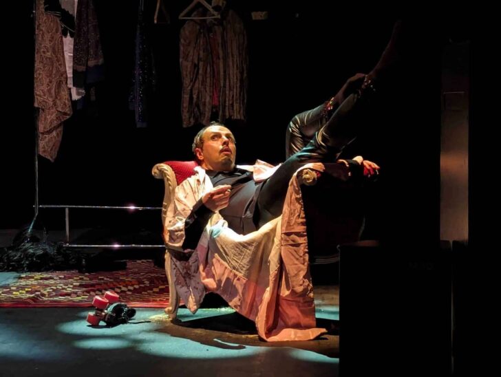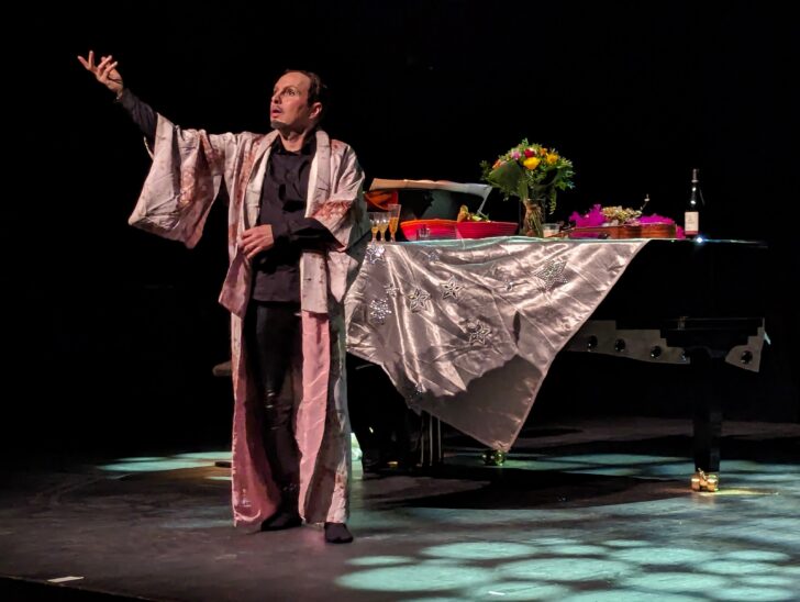 Né en 2020 au Festival baroque de Pontoise, et ayant subi quelques métamorphoses depuis, le ténor distancié de Jean-François Novelli est une caricature: garde-robe improbable, cascades chevelues à même de transformer Monsieur Tout le monde en Adonis, enfilades de poses à la rampe,… Les souvenirs ne manquent pas d'affluer d'un temps où le chanteur d'opéra n'avait pas à être un acteur. Dans une époque où il arrive encore, au détour d'une conversation, que l'on entende proférer : « Le problème à l'opéra aujourd'hui, ce sont les mises en scène », voir ressusciter le goût esthétique d'un temps presque révolu est forcément des plus réjouissants. Le ténor novellien, qui se targue d'avoir été à l'école d'un certain Robert Alagno, aligne tous les clichés qui accompagnent en sherpas la trajectoire du ténor d'opéra, de l'ascension à la chute, jusqu'à un épilogue apaisé où, telle Callas dans son appartement de la rue Georges Mandel, il sera contraint par les ravages du Temps qui passe, à poser tôt ou tard, sur son ego ébranlé par sa voix évanouie, le baume d'un vinyle crépitant rappelant aux oublieux qu'il avait été au sommet.