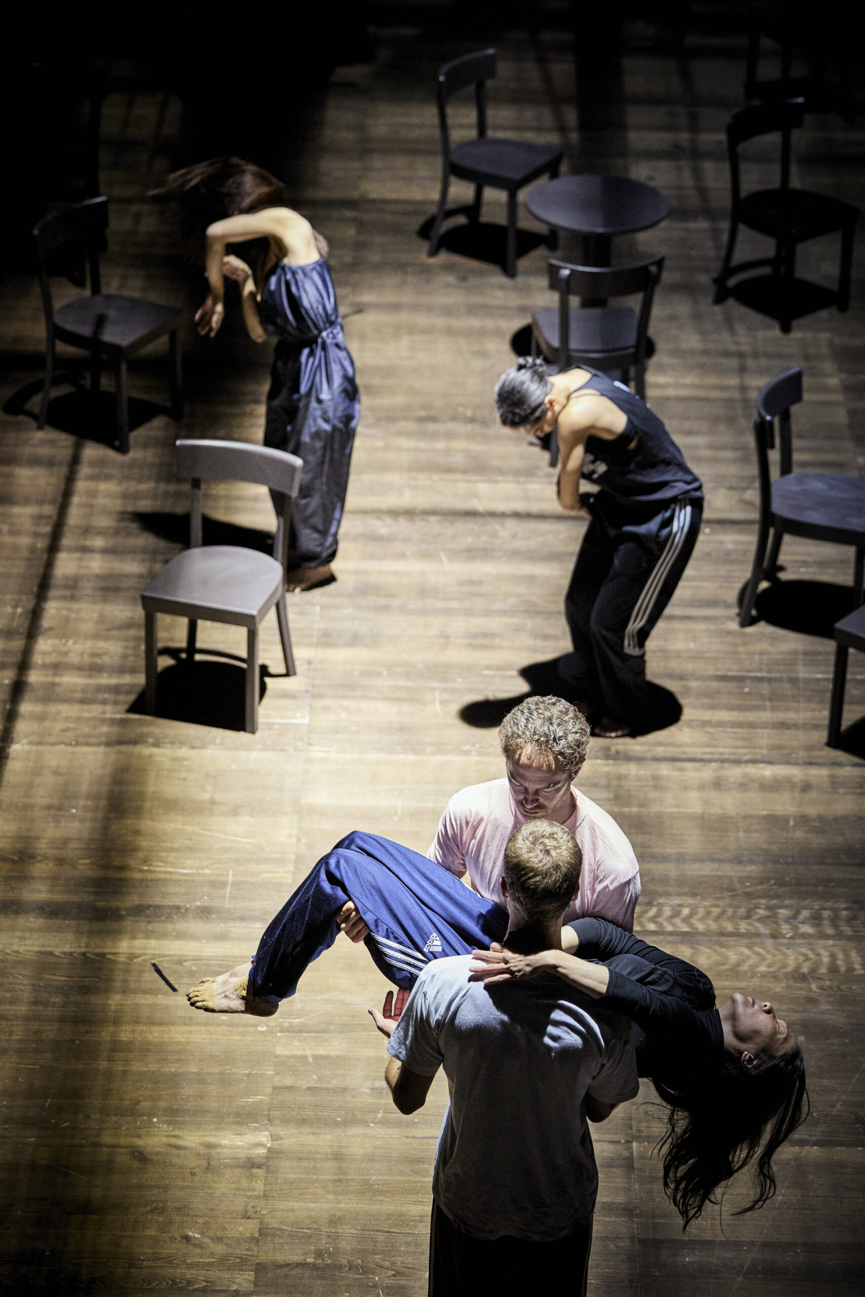 Naomi Brito, nouvelle révélation du TanzTheater Wuppertal (déjà remarquée dans Sweet Mambo) ou Héléna Pikon (qui raconte comment, Pina malade, elle se résout à apprendre le rôle) sont Pina. Simon Le Borgne est Dominique Mercy, Boris Charmatz est Jan Minarik, et c'est comme s'ils avaient toujours été danseurs de Pina. Certaines représentations se font en tenue de répétition, jupe fluide et T-shirt ou caraco et pantalon de survêtement, d'autres sont proposées comme au spectacle, en robes à bretelles, costume et chemise. La densité de ces interprétations est alors exceptionnelle, Boris portant Simon, Naomi se lançant sur les traces d'Héléna, on ne verra plus jamais Café Müller de la même façon.