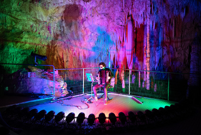 Le rendez-vous rafraîchissant (le thermomètre ne monte pas au-delà de 14°) dans les grottes des Canalettes est désormais reconduit chaque année, Pierre Bleuse rappelant au début de la soirée sa volonté de faire de ce lieu atypique celui de la création et de la découverte. En co-production avec la compagnie Flashback et son directeur Alexander Vert, le festival invite cette année Fanny Vicens, merveilleuse accordéoniste originaire du Roussillon qui joue ce soir sur ses terres. Véritable « rock star », avec ses lunettes noires et son accordéon microtonal, elle tient la scène une heure durant sous les lumières de l'artiste visuel Thomas Koppel.