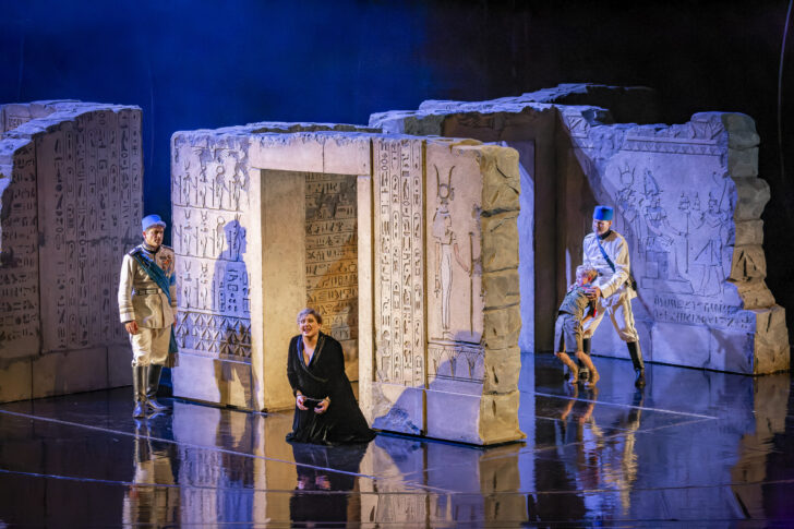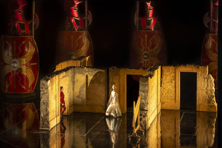 La mise en scène de Leo Muscato se contente d'une mise en place un peu trop sage : de gigantesques trophées en avant-scène sont vite relégués en fond de scène, l'espace étant durant presque toute la soirée occupé par des murs à décor égyptien sur une scène tournante. C'est un peu mince pour quelque 2 h45 de spectacle : certes l'espace change de scène en scène, mais les lieux ne sont pas plus clairement caractérisés et ne donnent pas un rythme au spectacle. Le mélange des époques, entre l'Égypte antique et les uniformes façon guerre d'Irak (mais en rouge) des soldats romains en passant par les costumes post-ottomans des Égyptiens, donne une certaine variété, mais ne suffit pas à raconter une histoire.