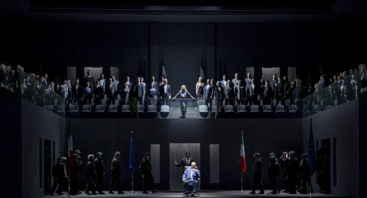 À côté de l'éblouissante beauté musicale de chacun des numéros de La Clémence de Titus, c'est sa formidable dramaturgie que sublime le metteur en scène canadien. Nous voici en Italie, à Rome, après que, par-delà les océans, une foule déchaînée par un politicien sans vergogne a tenté de mettre à terre la plus grande démocratie (en terme de surface) de la planète. Du décor austère, bien que verticalement modulable, de Gideon Davey (bureaux, salle de réunion au rez-de-chaussée avec drapeaux européen et italien, aréopage public à l'étage) aux costumes gris souris des phalènes du pouvoir, le spectacle, entre manigances et jeux d'influences, n'a rien de riant. On en ressortira ébranlé.