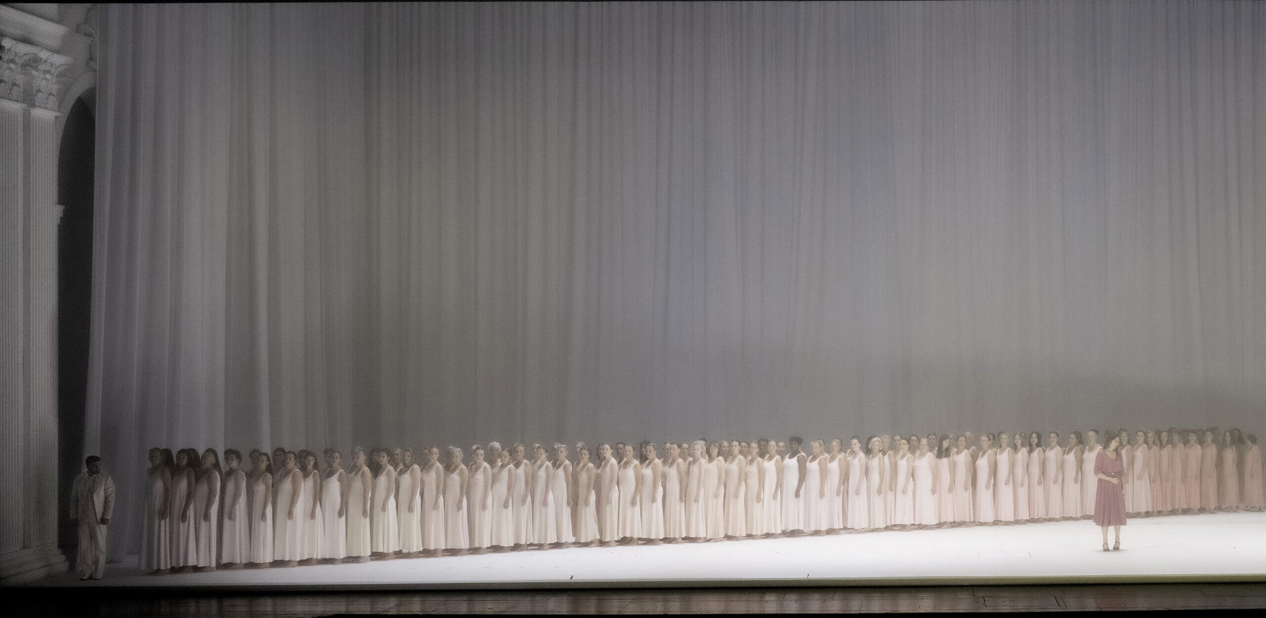 Ces sérieuses réserves formulées, ce Don Giovanni 2024 qu'on imagine à des années-lumières de celui qui ouvrit le premier Festival de Salzbourg en 1922, reste un des plus beaux spectacles qui soient. Du lieu saint (de ceux que l'on peut admirer dans la ville aux cent églises) longuement vidée de son mobilier (dans Jeanne au bûcher, à Lyon, il s'agissait d'une salle de classe), de cet espace mental occupant magnifiquement le cinémascope de la scène, au cimetière de Pompéi final, de l'agapé à l'eros, le metteur en scène italien questionne en profondeur le statut mythique du héros pourtant le plus animal du répertoire (chèvre, chien et rat sont de la partie), à vrai dire seulement fréquentable en scène, dont le seul mérite, dixit Castellucci, est de représenter la relation dysfonctionnelle que l'humain entretient avec le désir. Face à tant de noirceur, le jeu d'orgues est probablement le plus fascinant du moment avec sa symphonie de blancs : laiteux, bleuté, rosé, ou encore soudain plus blanc que blanc. Un sommet esthétique.