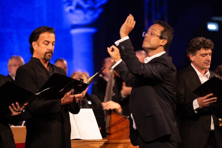 Les Vêpres de la Bienheureuse Vierge (Vespro della Beata Vergine, 1610) de Claudio Monteverdi sont un monde ou plusieurs mondes. L'auditoire y pénètre par l'introduction instrumentale joyeuse, voire triomphante et toute profane qu'il a sans doute reconnue comme étant celle également de L'Orfeo, le premier grand opéra de l'Histoire, créé trois ans plus tôt. La Cappella Mediterranea est rejointe immédiatement après, dans l'« Intonatio », par le Chœur de chambre de Namur, les deux ensembles sous la direction énergique de Leonardo García Alarcón. Le chef et claveciniste (ce soir, jouant de son instrument debout) donne du chef-d'œuvre une lecture historiquement informée, comme on dit, évitant toute bouffissure (la partition est déjà suffisamment dense), dans un spectacle bien rodé, cela se sent, puisqu'il l'avait dirigé en janvier avec les deux mêmes phalanges à l'Arsenal de Metz. On retiendra surtout de cet incroyable millefeuille recourant au plain-chant, à l'alternance de psaumes et de concertos, aux parties chorales, aux solos vocaux ou instrumentaux, aux dissonances, aux décalages rythmiques, à l'utilisation de l'écho et de l'ornement emprunté au quilisma grégorien (répétition rapide d'une même note par une voix soliste), au déplacement de chanteurs solistes comme dans le « Duo Seraphim », etc., la voix puissante et bien timbrée du ténor Valerio Contaldo (connu par ailleurs pour son incarnation d'Orfeo), la couleur particulière que donnent les sacqueboutes et surtout les deux cornets à bouquin, souvent dans des interventions virtuoses (excellentissime Doron Sherwin), pareillement les solos des violons (Tami Troman et Laura Corolla) qui offrent eux aussi des respirations. Sans oublier la vitalité ni le parfait équilibre des masses maintenus à bout de bras par García Alarcón. Dommage que la nef de la basilique paraisse étroite dans ce rassemblement de quelque 45 interprètes et que son acoustique marie si mal les voix aux instruments !