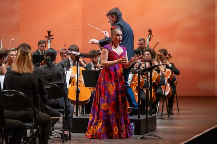 Le voyage italien se poursuit le soir au château Louis XI, avec l'ensemble Appassionato dirigé par Mathieu Herzog, dans un programme tout Berlioz. Première étape avec l'ouverture du Corsaire, d'après le roman éponyme de Byron. Finissant tonitruante et grandiose, la pièce contrastée sonne de tout son éclat dans une belle santé du son. Le chef emporte ses musiciens dans un lyrisme sans entrave, magnifié par le brillant des cordes. Puis les jeunes instrumentistes accompagnent, parfois un peu trop discrètement mais conduits avec tact par Mathieu Herzog, non pas Marina Viotti souffrante depuis le matin, mais Isabelle Druet venue la remplacer au pied levé dans Les Nuits d'été. Arrivée le soir même, la mezzo-soprano relève avec brio ce formidable défi – elle ne les a pas chantées depuis un an ! Le timbre généreux superbement coloré, sa voix ample, capiteuse dans la Villanelle, qui s'élance avec une facilité confondante vers les aigus projetant le « J'arrive » du Spectre de la Rose, et laisse entendre de beaux et sombres graves dans Sur les lagunes, se fait tendre dans « Reviens ! » d'Absence, et blanche, lunaire dans Au cimetière, conjuré par la joie irradiante de son Île inconnue. On salue sa diction exceptionnelle rendant totalement inutile le sur-titrage.