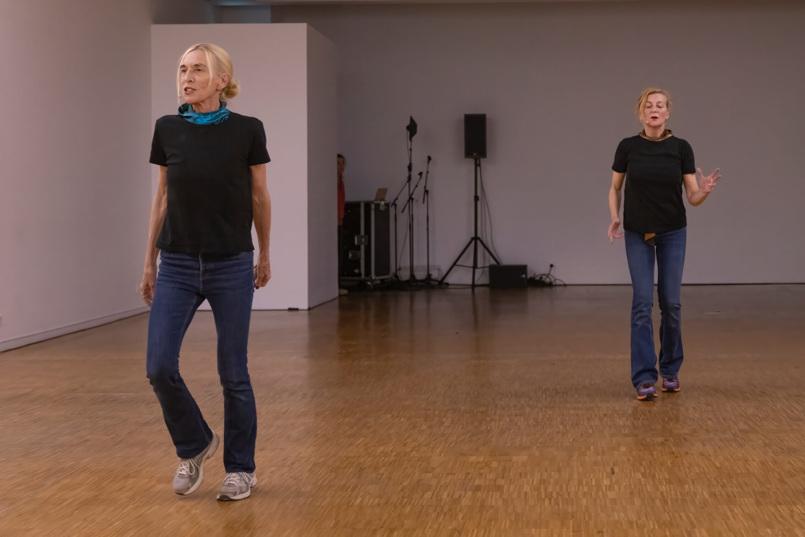 Un peu plus loin, dans une salle aux murs blancs, dépourvue d'œuvres, c'est un solo qui résume une pièce créée par Mathilde Monnier pour le groupe Dance on pour les danseurs de plus de 40 ans. Il s'agit du remontage d'un event de Merce Cunningham et de la réponse humoriste qu'y apporta Mathilde Monnier. Complices et toujours ultra dynamiques, La Ribot et Mathilde Monnier enchaînent en reprenant un duo de 2019, Please, please, please, créé avec Tiago Rodrigues. En face, un extrait de Black Lights, le spectacle le plus récent de Mathilde Monnier, brosse le portrait d'une femme en colère.
