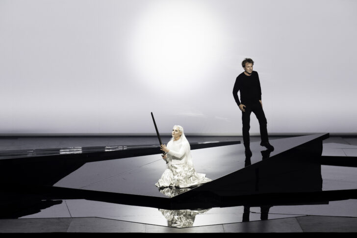 Une gigantesque lance-laser (souvenir du Ring d'Harry Kupfer à Bayreuth en 1988 ?) fibre l'espace à l'arrivée du Wanderer pour la sublime scène des énigmes, épicentre du premier acte ; elle scellera aussi, verte (de rage ?), la rencontre de celui-ci avec Alberich, avant de se briser comme par magie sous les coups pourtant distanciés de l'épée Notung au climax du dernier acte ! Le temps des hommes est enfin advenu.