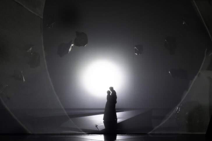 Pierre Audi fait le pari d'une certaine abstraction intemporelle, avec cette météorite géante et centrale – diversement éclairée – avec grand art par Valerio Tiberi- au fil du récit, magnétique et mouvante, entre autres exemples, pour figurer les écailles du dragon au deuxième acte – et comme explosée après la rencontre entre le Wanderer-Wotan avec son… petit-fils Siegfried : ses fragments suspendus ponctueront le décor de la scène finale, tels des ombres d'oiseaux augures de temps nouveaux.
