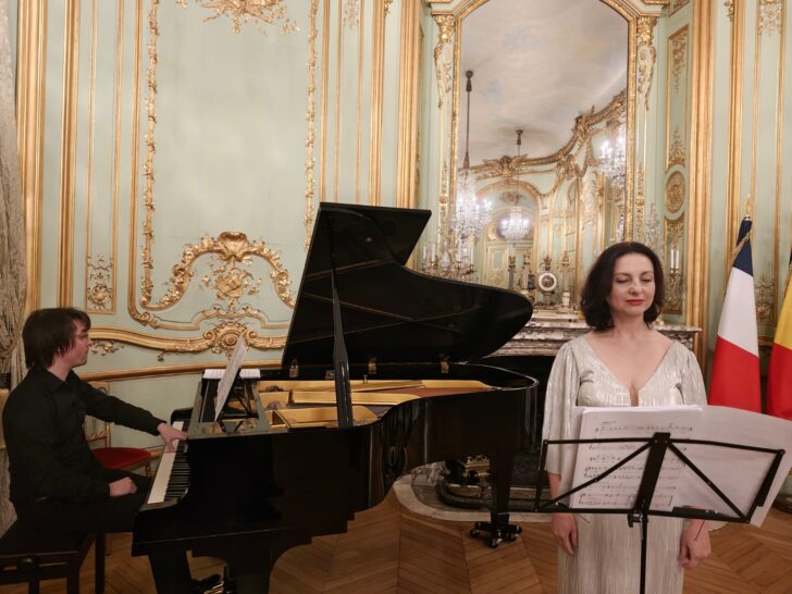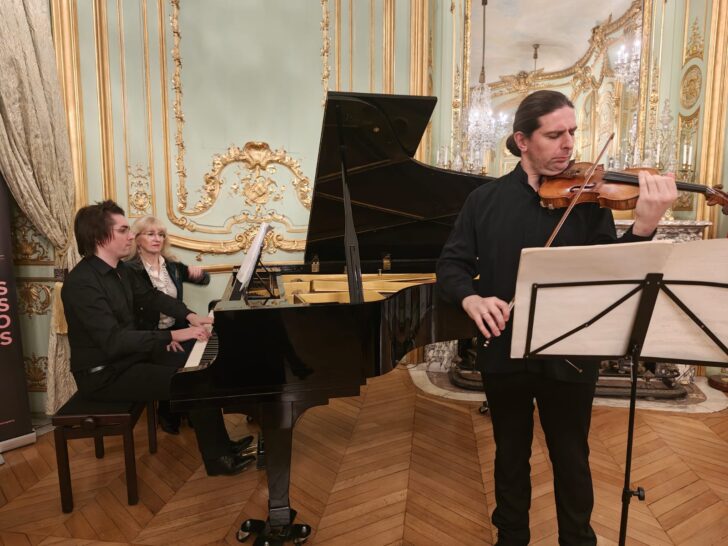 Paris. Ambassade de Roumanie. Salon doré. 12-X-2024. Mélodies de Georges Enesco, Henri Nafilyan, Dan Mizrahy, Diana Rotaru, Cleopatra Valentina Perepelita ; Georges Enesco (1881-1955) : Sonate pour violon et piano n° 3, dans le caractère populaire roumain. Cleopatra David (soprano), Julien Szulman (violon), Pierre-Yves Hodique (piano)