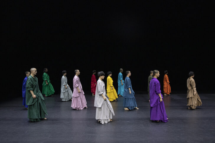 On retrouve bien plus d'énergie positive dans 14, ballet inversement coloré, puisque chaque danseur (tous habillés par Duan Ni, la femme du chorégraphe) a revêtu une longue robe et une longue veste chinoise aux couleurs différentes pour chacun. Fini le gris de masse, voici un vêtement rose vif, un autre violet, bleu canard, jaune, vert, orange… Et tous, rigoureusement alignés, vont sauter, courir, frapper le sol au rythme d'un seul et unique métronome. Les poses relèvent parfois des arts martiaux, du taï-chi, de la méditation bouddhiste. Tous sont dans une rigoureuse unisson chorégraphique et donc parfaitement unisexe. Ce qui est d'ailleurs assez perturbant car on ne distingue plus ni les hommes ni les femmes, tant ils se ressemblent. Cette unisson virtuose est certes réjouissante, mais il n'en résulte aucun effet autre que visuel. Un effet un peu vain, très « mode » et finalement, assez vide.