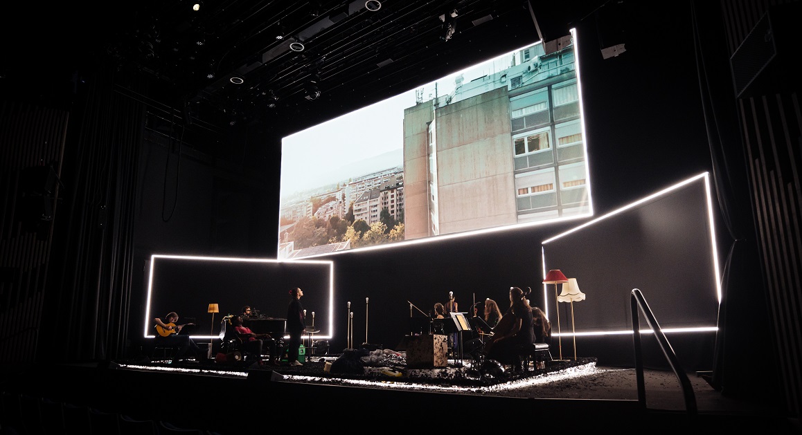 Sur un plateau aux dimensions délimitées par un fil de lumière, l'action scénique, les pieds dans la cendre (celle, on l'apprendra en fin de parcours, d'un immeuble effondré), dialogue avec l'action cinématographique diffractée sur trois écrans, chacun d'eux très esthétiquement cerné d'un liséré éblouissant la rétine à l'orée et à la conclusion de chaque séquence du film. Le dispositif n'est pas sans élégance, qui fait usage de sphères orangées aux allures de micros sur perches et même de micro-planètes. Les chanteurs au plateau sont aussi les acteurs du film en surplomb : le procédé, des plus troublants (comme dans les versions de concert de La Belle et la Bête de Philip Glass), donne l'impression que le film en 2D projeté en surplomb prend du relief avec les passages de relais entre la chair et l'os des chanteurs et celle de leurs doubles de celluloïd filmés en amont selon un scénario qui les aura fait voyager dans Genève et sa fameuse Cité Universitaire… Comme chez Kieslowski, comme chez Demy, les trois solitudes seront parfois amenées à se croiser, suivies de près par l'empathie du spectateur, auquel Murgia laisse une place assez conséquente. Presque trop, parfois : c'est la note d'intention qui nous apprend par exemple après coup que chacun des personnages, comme dans le film Perfect Sense de David Mackenzie, souffre, très belle idée, de la perte d'un sens : on avait bien remarqué que l'ouïe posait quelques problèmes à Arezki, la parole à Mariana mais on cherche encore les traces de la perte de la vue pour TK.