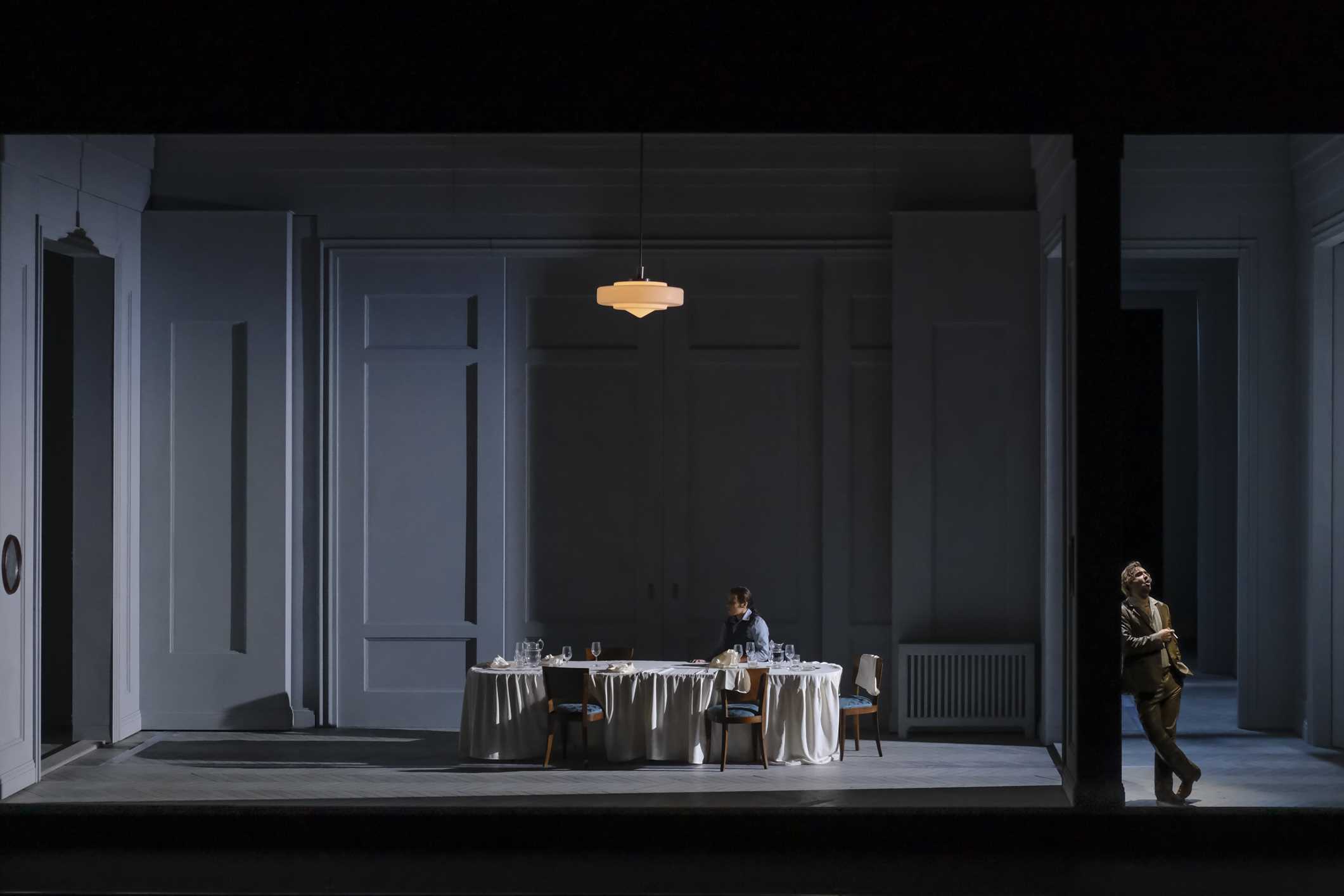 Costumes chics et contemporains de Uta Meenen, décor de salon feutré aux hauts lambris immaculés de Étienne Pluss, la scénographie choisie fait immédiatement penser aux univers de Robert Carsen, son Alcina au Palais Garnier notamment. Par la translation progressive des parois latérales, ce décor se rétrécit peu à peu, emprisonne les personnages dans leur douleur et révèle à côté les comportements parallèles hors scène. Les ballets hors contexte de la partition ayant été judicieusement omis, Jestke Mijnssen peut alors se concentrer sur l'évolution psychologique des caractères qu'elle détaille par une direction d'acteurs d'une extrême précision, toujours juste et lisible. C'est aussi ce qui faisait le prix de son Orfeo de Luigi Rossi à Nancy, spectacle qui la fit découvrir en France et obtint le Grand Prix de la critique 2016. Et même si l'inventivité tend à se réduire au fil du spectacle de plus de trois heures, l'intérêt demeure maintenu et les reprises da capo des airs parfaitement investies et toujours en situation. Après tant de trahisons, de méprises et d'impossibles communications, Jestke Minjssen ne peut se résoudre au lieto fine conclusif ; déjà très malade et alité, le roi d'Écosse meurt quasiment inaperçu et Ginevra s'enfuit du mariage en cours. Seuls peut-être Dalinda et Lurcanio auront-ils un avenir commun.