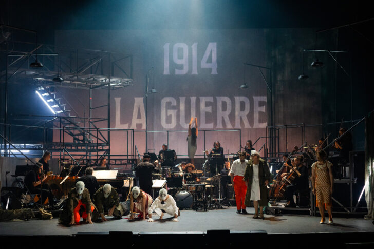 Tout se passe comme une immense mise en abîme, dans le prolongement de celle du spectacle de marionnettes au début de l'opéra, nous sommes comme placés devant les tréteaux sommaires d'une troupe de foire : on en voit les fils, les décors, les artifices, les ustensiles. Le metteur en scène Jean Lacornerie nous laisse interpréter, à l'image des échafaudages bruts que le public doit habiller d'imaginaire. Deux de ses récentes mises en scène d'opéra, vues également à Rennes (La Chauve-souris de Johann Strauss II et La Sérénade de Sophie Gail), proposaient ce même pas de côté dont le principe fonctionnait très bien. C'est plus difficile ici : on peine à se laisser prendre par le récit et son commentaire continu. Lors des changements de tableaux, si certaines visions du metteur en scène emportent l'adhésion (le passage de la grand' place aux hôpitaux de Guernesey et de Roscoff, le début de la Grande guerre), d'autres nous laissent dubitatifs (le retour à la paix, le dernier spectacle de marionnettes).