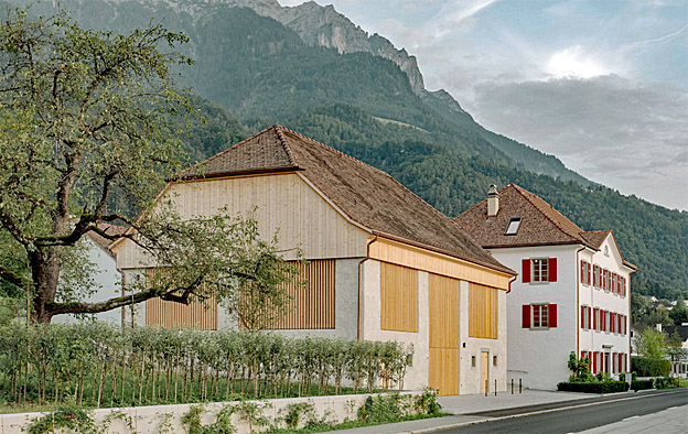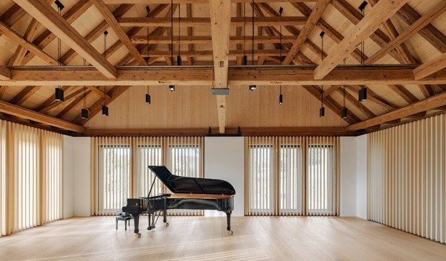 La grange a été transformée en salle de concert de musique de chambre. Le revêtement historique de la façade, en bois, a été réinterprété avec des lattes de bois réglables.