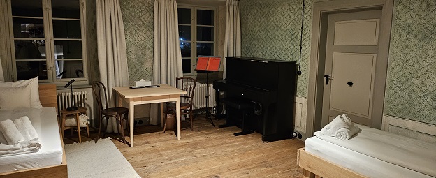 Dans l’ancienne écurie, la salle de concert, qui peut accueillir jusqu’à 150 personnes, dispose également de deux pianos à queue, un Steinway construit pour Grigory Sokolov et un Bösendorfer choisi par le boursier de l’Académie Dmitro Choni.