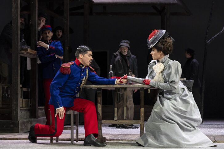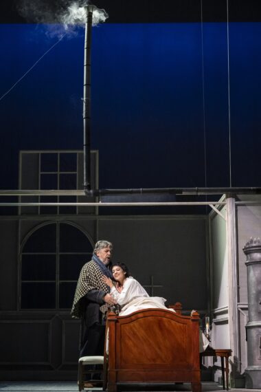 Que seraient le chant et le théâtre sans la poésie des décors et des costumes ? Pour ces derniers, dessine un tableau chaleureux du début du XXe siècle avec femmes toutes vêtues de robes à traîne aux couleurs pastels et leurs amples chapeaux, ses ouvriers aux habits bruns et gris sombres, ses militaires aux pantalons rouge vifs, tuniques bleues, et casquettes bicolores. Pour le décor, quelle superbe poésie nous offre quand, par exemple, il nous montre ce poêle rougeoyant dont la fumée blanche s'élève de la cheminée vers un ciel de nuit.