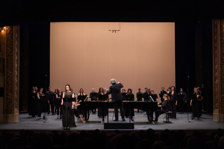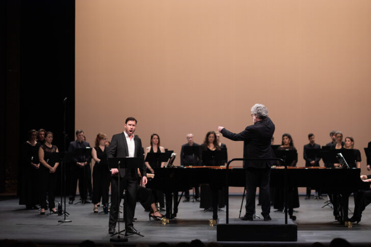 Après le retour de Damien Pass et l'évocation de la vie éternelle, le Chœur Mélisme(s) s'illumine une dernière fois au-dessus des deux pianos pour louer le bonheur des morts qui meurent avec Dieu, puis sans accompagnement après les saluts, pour un bis annoncé par Gildas Pungier : l'Abendlied d'un contemporain de Brahms, Josef Rheinberger.