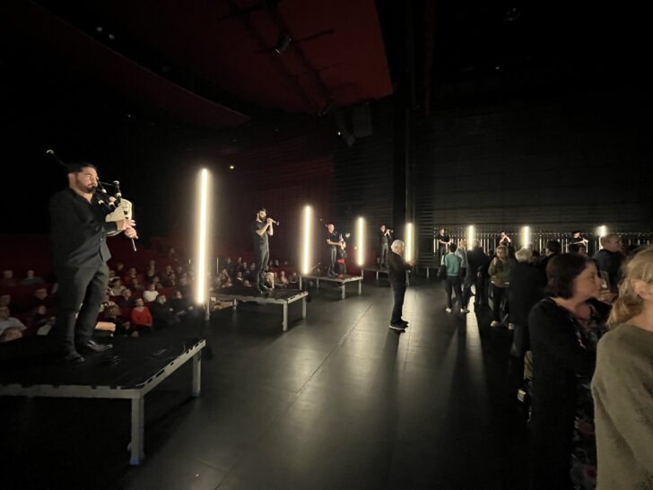 Les bombardes et cornemuses sont déjà en train de sonner (un do flotte dans l'air) lorsque le public fait son entrée. Les vingt sonneurs (Erwan Keravec et la Cie Offshore) sont installés sur leur estrade respective en un cercle de vingt mètres de diamètre rythmé par vingt bâtons de lumière. Le public a la liberté d'être au centre du cercle ou en dehors, debout ou assis (voire allongé), gérant son écoute et sa propre relation à l'œuvre.