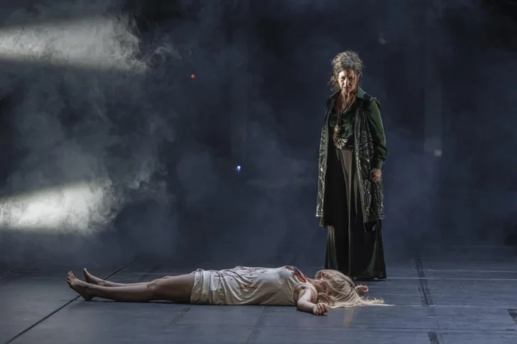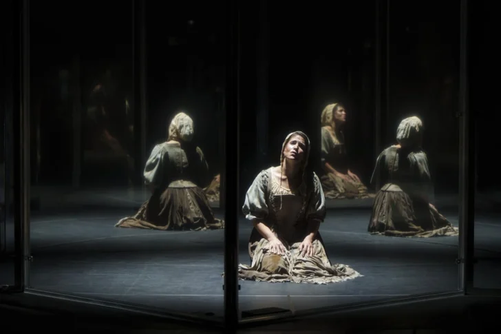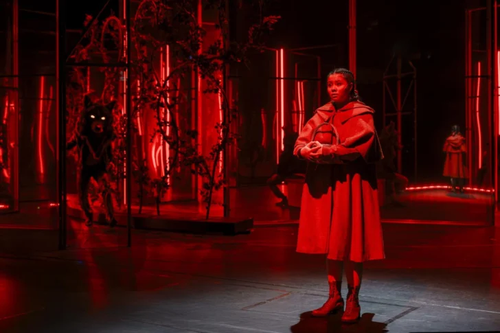 En attendant, comme des enfants devant une boule à neige, l'on n'a de cesse d'admirer, l'impressionnant travail scénique comme la fascinante scénographie dans lesquels Martin G. Berger a immergé ses chanteurs. Passé un bref prologue devant une toile chipée dans un recueil de conte de fées avec costumes d'époque autour d'un narrateur tout de blanc vêtu, apparaît très vite la forêt du titre, une forêt bien sûr fantasmée, plantée de néons et de miroirs, qu'une double tournette à deux sens anime jusqu'au vertige : apparitions, démultiplications se succèdent comme autant de tours de passe-passe. Ce dispositif à haut pouvoir esthétique (la superbe scène rougeoyante entre Chaperon et Loups aux pupilles luminescentes n'en est qu'un des incessants sommets) laisse progressivement place au dépouillement : le plateau recule tout entier pour laisser au premier plan des personnages qu'une seconde peau de costumes contemporains a entre-temps propulsés dans notre époque. Livrés à leur contradictions, et après avoir enfin considéré leurs agissements respectifs, chacune et chacun seront en mesure de confier au spectateur une philosophie de vie qui, Broadway oblige, conclut l'action à 180° de la comédie musicale à la française : au « on est toujours tout seul au monde » des Parapluies de Cherbourg et de Starmania, Into the woods préfère proférer : « No one is alone ». L'amateur de divertissement auquel chaut peu l'émotion peut quitter la salle, rassuré.