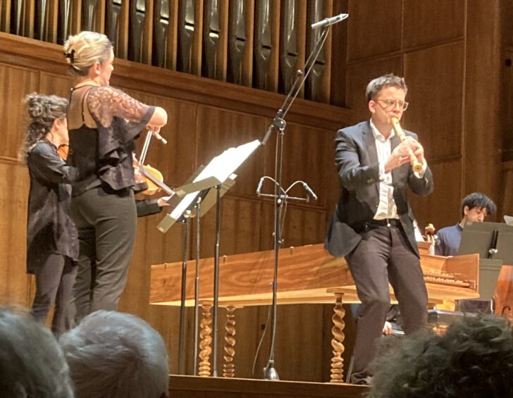 Cette situation bien particulière semble avoir eu un effet dynamisant sur l'ensemble baroque comme en témoigne l'incroyable énergie dont il fait preuve dans la Fugue de Hasse qui ouvre le concert. Mais, c'est avec le Concerto pour flûte à bec en fa majeur de Giovanni Sammartini que Il Pomo d'Oro va emmener le public dans son escarcelle. Ou plus exactement avec l'incroyable prestation de Max Volbers offrant une démonstration enflammée de ce concerto. Grâce à une technique de contrôle du souffle bien particulière, il peut donner de la puissance à son instrument sans être contraint d'entrecouper ses phrases pour reprendre sa respiration. On peut ainsi jouir pleinement de la ligne mélodique, du phrasé, des variations de volume sonore. Et en musicien averti, il s'implique à une interprétation de belle facture. Dans l'Adagio, on goûte au soin qu'il apporte à la sonorité de son instrument. Le final Presto est emmené de manière brillantissime. Le pari est gagné. Oubliées l'absence de Julie Fuchs, ses vocalises se retrouvent dans la flûte de Max Volbers.