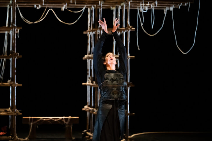 Voilà Marie-Agnès Gillot, hiératique et immobile, transformée en samouraï, harnachée jusqu'au menton dans une carapace de cuir noir à bavolets rigides. Un costume signé de la plasticienne Morgane Tschiember, qui a également conçu le décor. La danseuse se tient en effet sous un tori, ces portes de temple que l'on trouve au Japon, ici construit sous la forme d'un échafaudage traditionnel en bambou et cordes. Elle est assise, d'abord immobile, sur un petit banc – on pense au banc sur lequel Giselle effeuille la marguerite en attendant Albrecht – qui deviendra un accessoire important dans la suite du solo, tour à tour piédestal, autel, massue ou gibet.