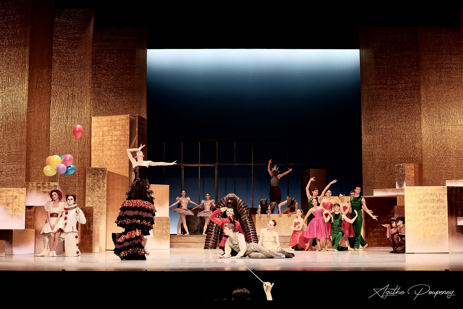 Après l'entracte, on retrouve de la verticalité et une opulence très bienvenue dans le riche décor doré du deuxième acte. Mr et Mme Drosselmeyer, ainsi que Clara, en tenue de fête, peuvent ainsi accueillir les personnages qui franchissent tout à tour la porte magique du Royaume des jouets : une Espagnole déchaînée, que l'on dirait juchée sur des échasses, mais dont la longue robe à pois cache en réalité un danseur ; un slinky géant, ce ressort spectaculaire qui fait rire les enfants ; un couple de clowns rêveurs aux jolis ballons ; deux poupées mécaniques qui se poussent du coude ou une sarabande de serpents aux accents orientaux. Cette galerie de personnages remplace les danses espagnoles, chinoise ou arabe de la version traditionnelle, en offrant de la fantaisie visuelle et de l'humour, tout en s'insérant harmonieusement dans la dramaturgie. Une très astucieuse façon de dépoussiérer un ballet qui est un classique des fêtes de fin d'année !