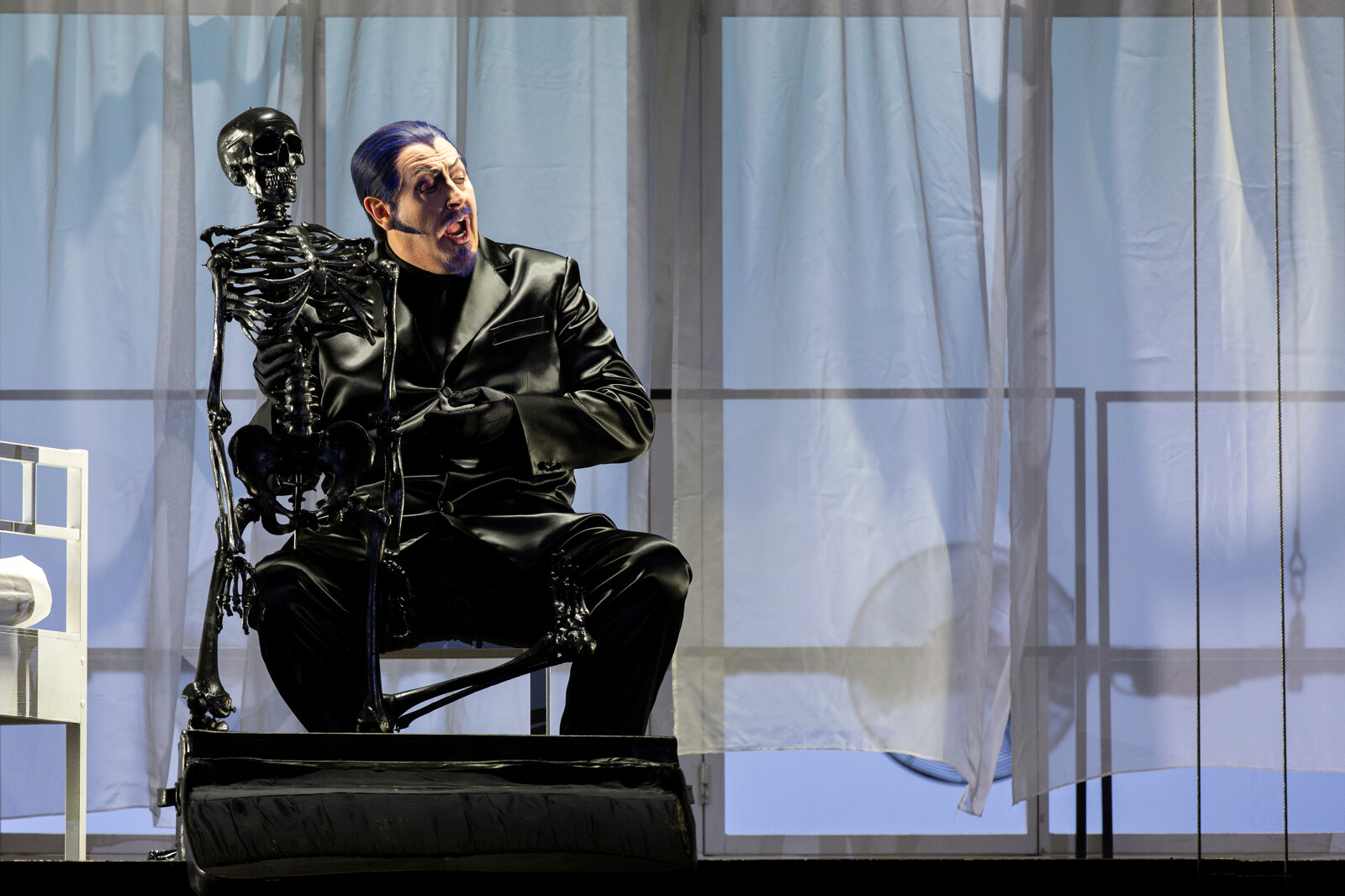 Avant même la première note, le spectateur qui a suivi la carrière lyrique d'Olivier Py est en terrain familier. Au pied de l'élégante boîte noire de Pierre-André Weitz, incrustée dans le cadre de scène, l'attend déjà le memento mori décliné spectacle après spectacle en nature morte : un crâne, accompagné cette fois d'un sablier. Un bref prologue muet permet au diable imaginé par Wystan Hugh Auden et son complice Chester Kallman de s'emparer de ce dernier : on comprend d'emblée que la part d'ombre (nommée Nick Shadow, on ne saurait moins bien cacher son jeu) d'un héros nommé Tom Rakewell (on ne saurait être plus explicite) et amoureux d'une jeune fille appelée Anne Truelove (décidément tout est dit) va prendre les rênes de l'action.