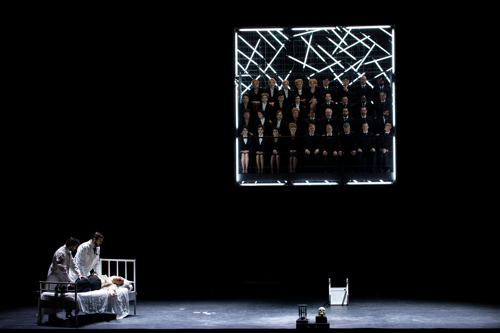 La très probe direction de Susanna Mälkki allège la noirceur acidulée de la partition, le spectacle paraissant de ce fait moins funèbre qu'imaginé, même lors d'un finale assez déchirant avec un Tom Rakewell qui, après avoir basculé dans la déréliction, en pietà dans les bras d'une femme décharnée, veillé par un spectre dansant quasi-nu qui l'épiait depuis le début, rêve la dernière apparition d'Anne Truelove : une belle idée de mise en scène, qui dit bien que la jeune femme, dessillée quant à la triste carrière de son libertin, s'est enfin lassée du salut d'un jeune homme qui aura préféré la mort.