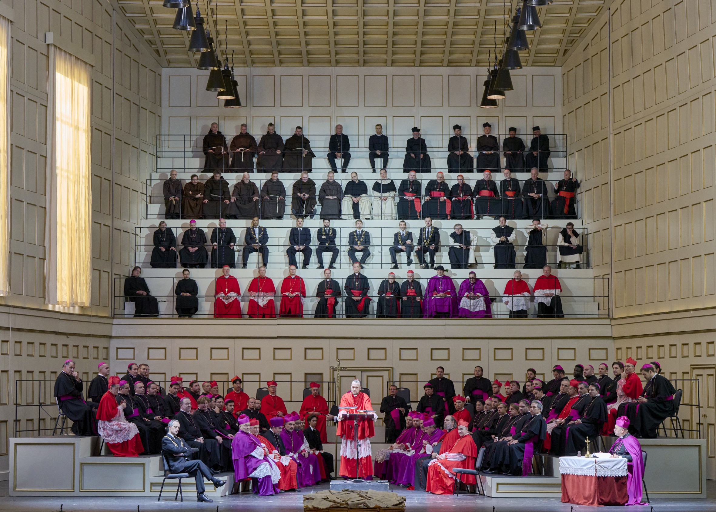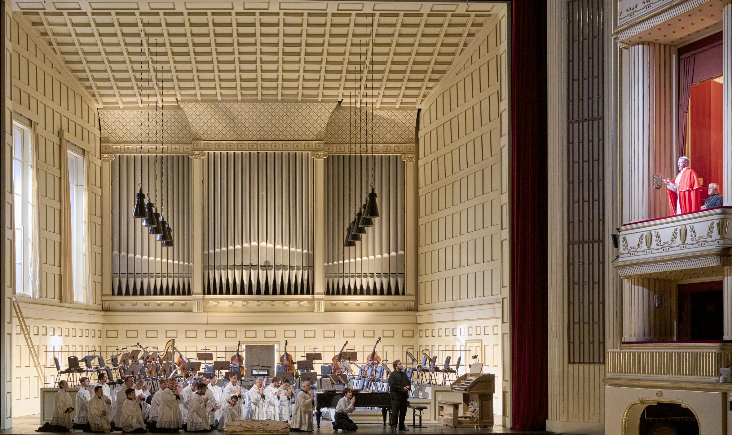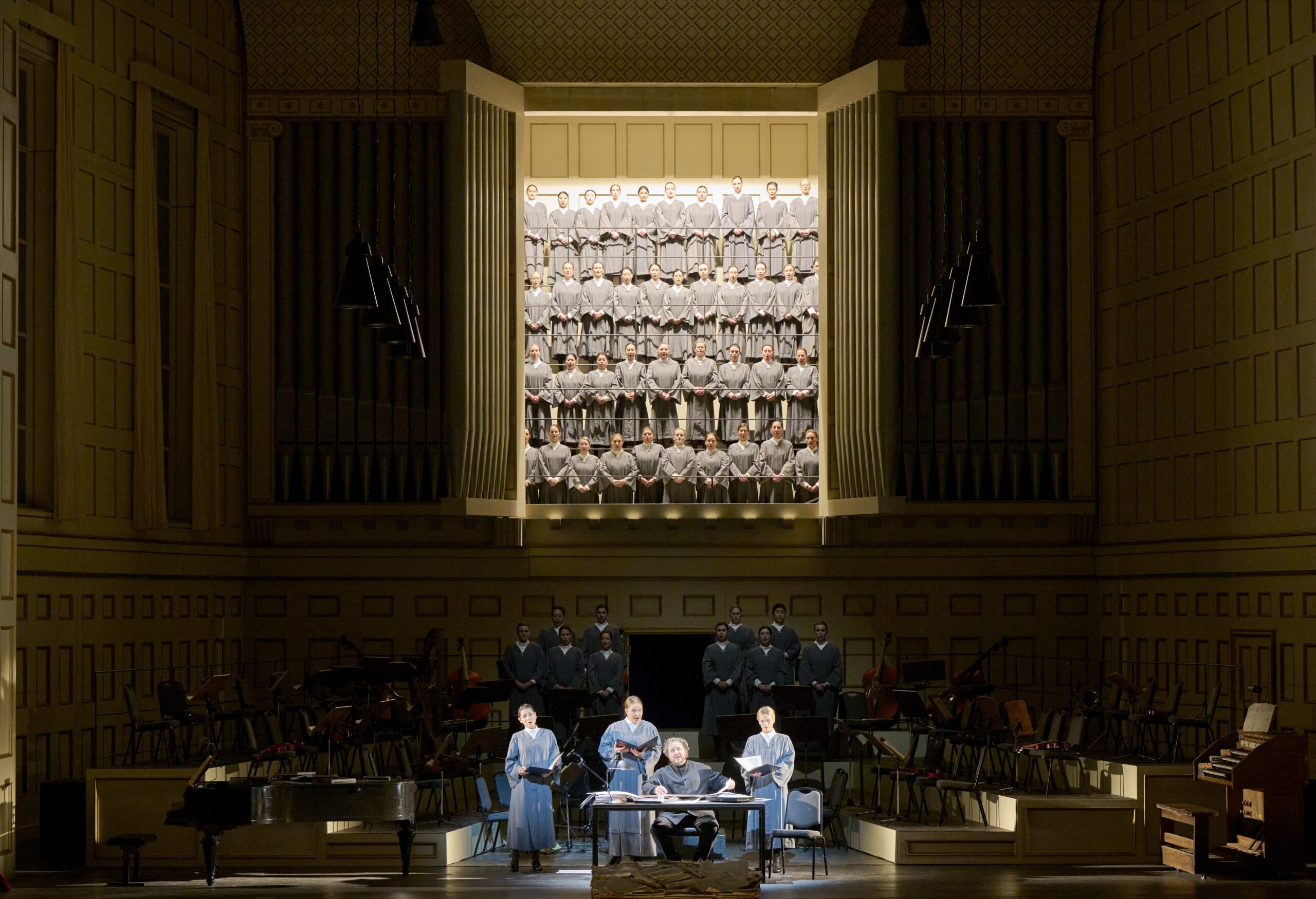 Beaucoup moins passionnante, la mise en scène de Wernicke (reprise alors même que le Met redonne en ce moment sa Frau ohne Schatten de 2001), ne parvient jamais à exalter le propos du livret. On aimerait croire dans le premier duo féminin, où l'habit gris de Silla pourrait faire penser à Pfitzner et le costume d'Ighino à Mahler, que le metteur en scène mort en 2006 a tenté un parallèle entre le combat de la modernité musicale de Palestrina et Ighino avec celui de la Vienne du début du XXème siècle. En cela, le décor d'une salle au style proche de certains Konzerthaus de l'époque, avec des instruments d'orchestre tout autour, pourrait nous conforter dans l'hypothèse. Mais, sauf à la dernière scène où Palestrina se met au pupitre pour diriger, rien ne contribue vraiment, pendant les 3h20 de musique, à porter cette vision d'un combat pour l'art nouveau. Au contraire, les costumes de religieux mêlés à ceux des nobles viennois et à un chant presque toujours sur l'avant-scène ramènent à une dramaturgie très classique. Celle-ci est à peine rehaussée à l'ouverture par les grandes orgues en fond de salle, qui servent à imager les voix célestes du chœur – excellent – étagées à l'intérieur.