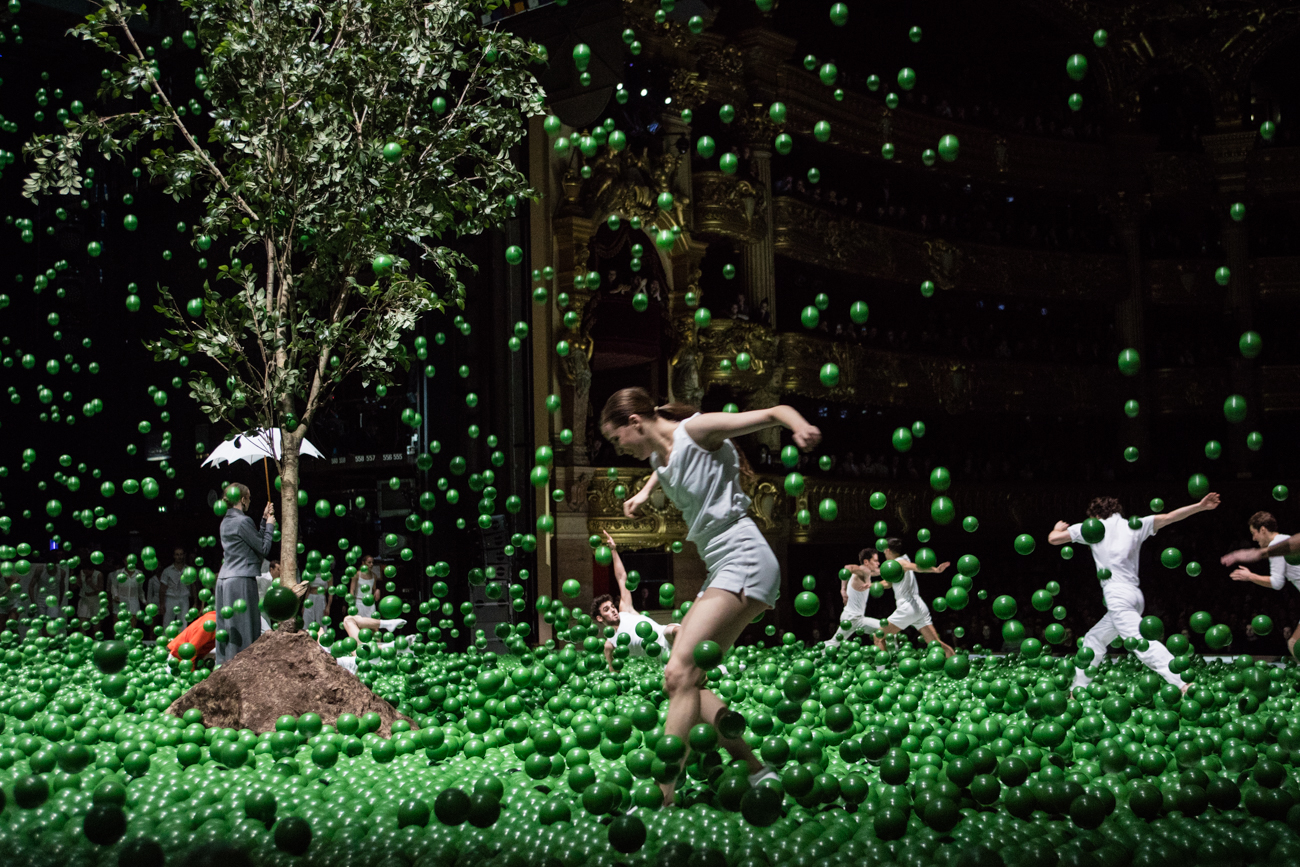 L'image est devenue célébrissime : un flot de balles vertes se déverse sur la scène de l'Opéra Garnier avant d'être envoyées dans la fosse d'orchestre pendant l'entracte. C'est qu'Alexander Ekman a le sens de l'effet visuel et sait imprimer durablement des images chez le spectateur. Le rideau s'ouvre sur une scène blanche avec les musiciens placés en mezzanine et des cubes au plafond, cubes qui seront ensuite descendus et serviront de support à différentes scènes. Le premier acte est celui des jeux de l'enfance, de l'innocence. Les danseurs en groupes, telle une bande d'écoliers, jouent, explorent, chahutent sous le regard sévère d'une surveillante visiblement dépassée. C'est la lutte entre la liberté et le carcan. Tout le propos du ballet est présent dans cette scène : comment rester libre, jouer, explorer, créer lorsque grandir signifie apprendre à rentrer dans un moule ? S'ensuit une juxtaposition de scènes où les jeux de groupe côtoient les jeux amoureux, le déguisement (les femmes biche, le magnifique homme en jupon géant), les jeux bruyants matérialisés par Ida Viinkinkoski frappant un cube de sa pointe, le bruit étant amplifié par le micro frappé de Loup Marcault-Derouard.