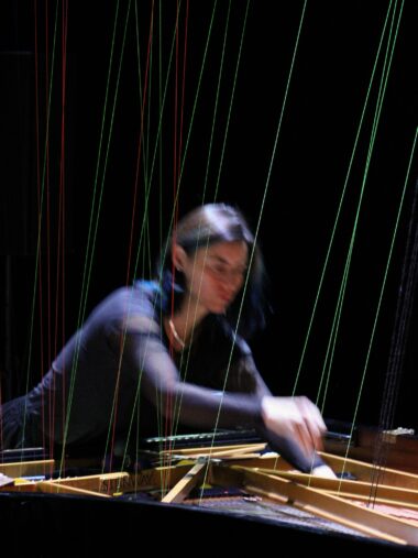 Du solo à l'ensemble, le passage est fluide et rapide. Le plateau s'éclaire, dévoilant le riche dispositif instrumental et la présence de filins tendus obliquement depuis les cintres. Strands, le titre de la nouvelle pièce de Jérôme Combier pour sept instrumentistes (les musiciens de l'ensemble Multilatérale) et électronique, se traduit par « fils », comme ceux des toiles d'araignée du plasticien argentin Tomás Saraceno qui sont à l'origine du projet sonore. Deux plaques-tonnerre géantes sont suspendues en fond de scène tandis que le set de percussions se prolonge à cour avec une autre surface métallique légèrement convexe posée sur deux supports que la percussionniste Hélène Colombotti, fort sollicitée ce soir, viendra faire résonner en solo. Le registre instrumental tire vers le grave, de l'alto à la contrebasse : « (…) parce qu'elles ont l'ombre des abîmes (…) », sous-titre le compositeur. Ni flûte ni violon mais une harpe et un piano très actifs. Conduite avec autant de souplesse que de précision par Rémi Durupt, la musique qui s'entend est impalpable, avec ses figures elfiques qui disparaissent à peine dessinées ; elles n'en nourrissent pas moins un flux continu, capricieux et fantasque, avec ses accélérations, perturbations et bouffées de lyrisme, entre éclairs furtifs et outrenoirs profonds. L'espace s'ouvre progressivement où s'éploient d'autres lignes aux inflexions microtonales d'un lointain Orient. L'arrivée du marimba et ses sonorités boisées texturent le flux sonore dans un temps « heurté », selon le mot du compositeur. L'intensité lumineuse décline tandis que Lise Baudoin (pianiste) et Hélène Colombotti, stylets en mains, se dirigent vers les plaques-tonnerre pour générer sur ces deux surfaces métalliques, via le dispositif électronique, des résonances « douces et obscures ». L'instant est éminemment poétique et hors cadre… Revenue à son piano, Lise Baudoin commence à tirer des fils entre les cordes de son instrument, un mode de jeu qui contamine l'ensemble des instruments à cordes. Monte alors en puissance, dans les dernières minutes de l'œuvre, un son au grain inouï, résonance « migalomorphe » très impressionnante à laquelle l'électronique donne une ampleur et une matérialité quasi haptiques.