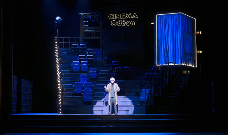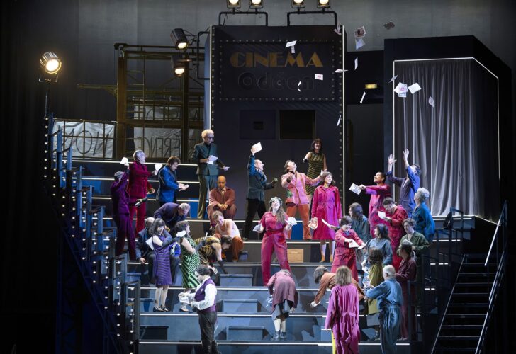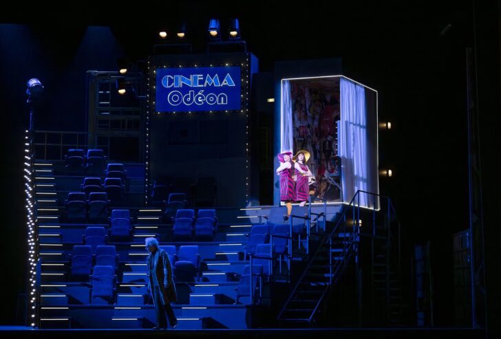 Assez vertigineux, monté sur tournette, le dispositif scénographique janusien de Bruno de Lavenère fait alterner le labeur (l'usine Renault dirigée par Larivaudière avec ses 4L à la chaîne) et le divertissement (le cinéma L'Odéon dirigé par Mademoiselle Lange avec son bureau tapissé d'affiches de films). De subtils surlignages de néons permettent aux lumières de Laurent Castaingt d'atteindre une rare élégance dans le cinéma, où la si savoureuse scène des conspirateurs voit son ballet malicieusement remplacé par une tentative de séduction des CRS (« La Police avec nous ! » entendu sur les barricades d'alors) dans une pénombre de salle obscure seulement traversée par le faisceau du projecteur venant de lancer le film : probablement le moment le plus émouvant de la représentation. Car on ne fait pas que sourire dans cette Fille de Madame Angot au militantisme lisible jusqu'au terme de l'Acte III (savoureux Bal de Calypso en boîte de nuit) avec le judicieux pas de côté d'avec la doxa amoureuse de son ultime graffiti.