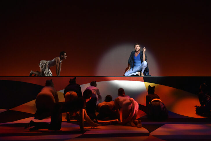 Paris. Théâtre de Chaillot. 8-I-2025. Marlène Saldana et Jonathan Drillet. Les chats (ou ceux qui frappent et ceux qui sont frappés). Création musicale : Laurent Durupt. Scénographie : Théo Mercier. Costumes : Jean Biche. Masques : Vanessa Riera. Interpètes : Alina Arshi, Jonathan Drillet, Mai Ishiwata, Christophe Ives, Dalila Khatir, Aurélien Labenne, Mark Lorimer, Guillaume Marie, Marlène Saldana, Stephen Thompson, Charles Tuyizere.