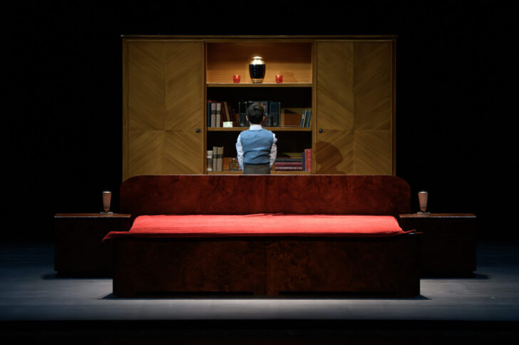 Les premières notes sont précédées d'un pesant silence ponctué de râles, d'abord tuilés avec l'à-propos de la déploration straussienne, avant de s'éteindre au diapason de l'action scénique : agonie, habillage de la défunte (comme dans le Requiem de Castellucci, elle finira engloutie dans son propre lit), déluge de fleurs mortuaires, urne funéraire… Lorsqu' au bout d'une demi-heure arrive la célèbre citation de la Marche funèbre beethovénienne qui a servi de matrice compositionnelle à Strauss, la messe est dite : trente années plus tard, à jamais hanté par ce deuil mettant un terme à une relation filiale passionnelle, et parentale mortifère, l'enfant restera un enfant à jamais empêché dans ses désirs d'adulte. Peuplé de fantômes, Le Château de Barbe-Bleue version Pitoiset, avec l'urne maternelle conservée dans la chambre, c'est un peu la maison de Psychose.