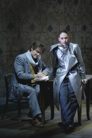 L'Opéra national du Rhin s'est donc basé sur leurs études pour proposer « sa » version. Avec Lotte de Beer à la mise en scène, il a fait le choix d'une version avec dialogues parlés écrits par Peter de Nuyl qui déplacent le centre de gravité de l'œuvre. C'est cette fois la Muse/Nicklausse qui est le maître du jeu. Descendue de l'Olympe pour assister l'écrivain Hoffmann dans son accomplissement artistique, elle n'aura de cesse de lui démontrer que la succession de ses amours malheureuses, réelles ou imaginées, n'est due qu'à son nombrilisme, son narcissisme, son masculinisme triomphant qui ne tiennent jamais compte des désirs et de la psychologie des femmes rencontrées, lesquelles ne sont que des figures stéréotypées issues de son imagination et sans profondeur. Deux Hoffmann s'affrontent (le chanteur est doublé sur scène par un figurant) : l'artiste aux aspirations supérieures et l'homme gouverné par ses pulsions qui se réconcilieront à l'épilogue. Le gros inconvénient est que ces dialogues, qui compliquent la narration plus qu'ils ne l'éclairent et le plus souvent donnés devant le rideau fermé pendant que le décor change, hachent la continuité du spectacle qui en devient une suite de numéros musicaux pas toujours évidente ni logique. L'Acte de Venise en apparaît particulièrement décousu.