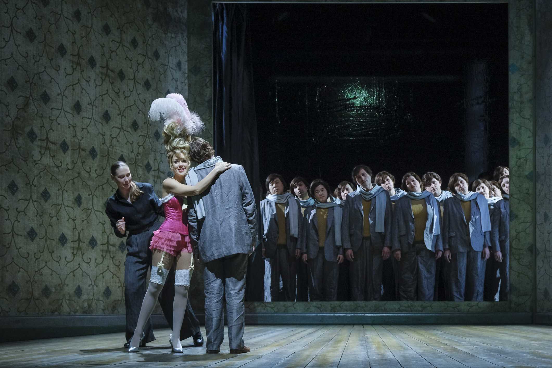 Sur le plan visuel, le décor de Christof Hetzer en perspective raccourcie n'est pas particulièrement seyant, avec son papier peint défraîchi ou sa grotesque poupée géante animée. Il projette en revanche très bien les voix, trop bien même parfois. Lotte de Beer n'oublie pas le côté fantastique avec des changements d'échelle des éléments du décor (tables et chaises de la taverne, poupées de l'acte d'Olympia) ou avec un acte d'Antonia très réussi où bouquets, mains, le Docteur Miracle et même la Mère d'Antonia sortent des tableaux accrochés au mur. Là aussi, l'Acte de Venise convainc moins avec ses péripéties peu claires et son chœur à l'étroit dans l'espace réduit. Chez Lotte de Beer, les quatre incarnations du Mal sont plus ridicules qu'inquiétantes et celles des quatre femmes se conforment à un idéal féminin fantasmé par les hommes, qu'il soit érotique ou domestique.