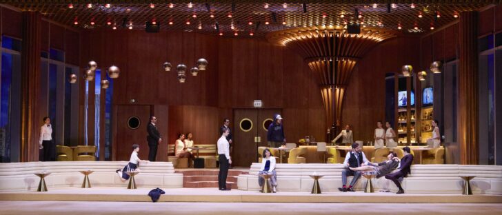 Dès le lever de rideau, le spectateur est transporté dans un gigantesque et luxueux appartement-terrasse où de jeunes femmes court-vêtues servent boissons et autres amuse-gueules à quelques hommes d'affaires. Salomé, des écouteurs sur les oreilles, déambule nonchalamment au milieu de cette petite société. Elle est totalement indifférente au chant de Narraboth, un jeune Syrien éperdument épris de la princesse. C'est du moins ce que l'argument de l'opéra donne à comprendre. Sauf qu'ici, alors qu'on a à peine entendu deux mesures de musique, que l'agitation autour de ces deux personnages est telle qu'on peine à distinguer de quelle bouche sort ce «Wie schön ist die Prinzessin Salomé heute nacht!», une superbe intervention du ténor Matthew Newlin avec une voix qui n'est pas sans rappeler celle de Gösta Windbergh qui avait enchanté le Grand Théâtre de Genève dans ce même rôle en février 1983 dans la mise en scène de Maurice Béjard.