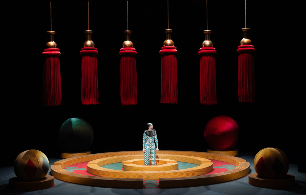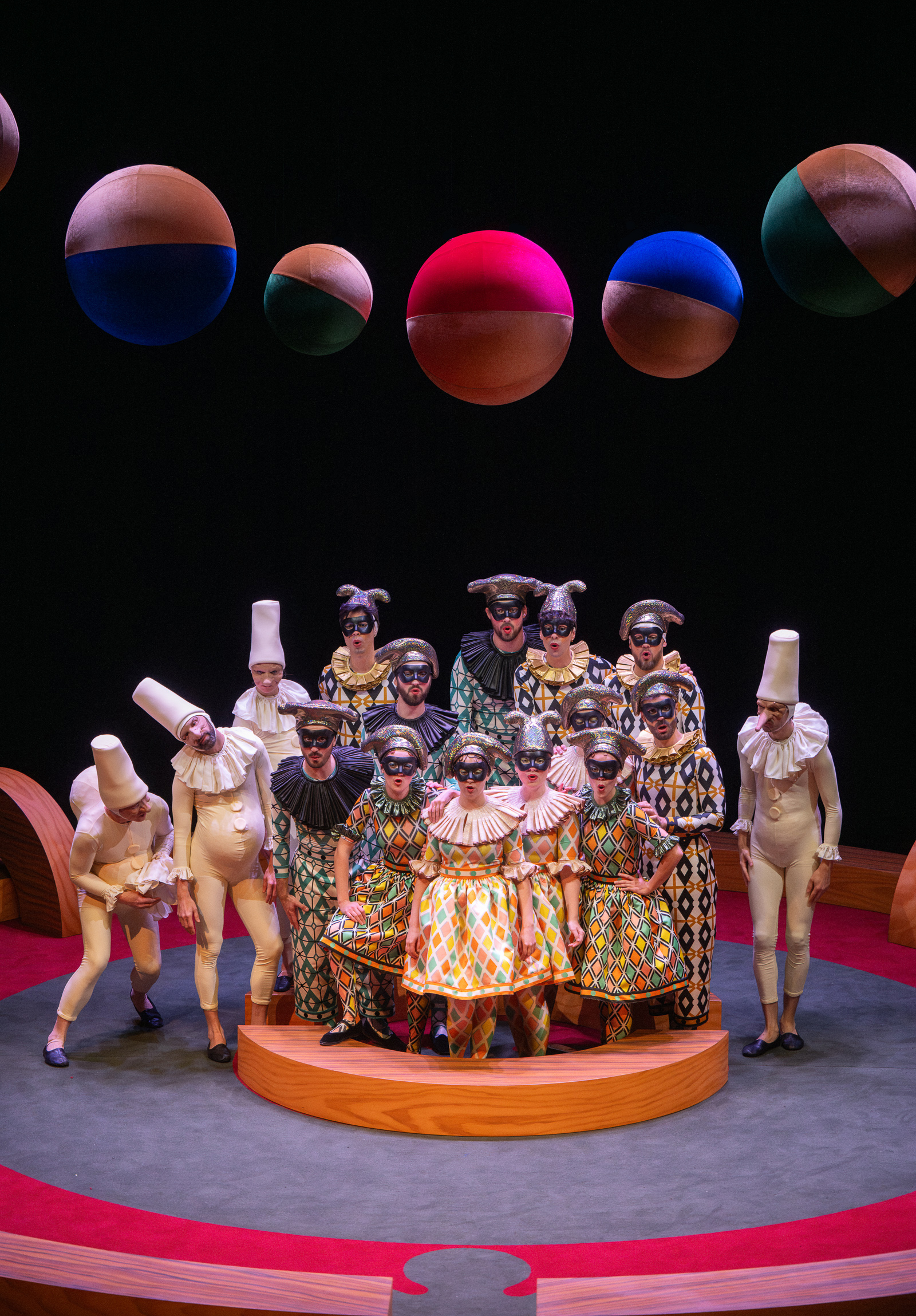 Ce désordre initial, vite agencé en cercles concentriques, trace ensuite les contours de son propre cosmos, au moyen de ballons colorés de toutes tailles, qui, posés sur des orbes de bois, font progressivement naître l'image d'un système solaire. L'atemporalité de cette aire de jeu modulable (superbes apparitions de sphères joueuses en apesanteur) n'empêche ni l'évocation d'une Venise fantasmée, lorsque les arceaux de bois renversés font penser aux ponts de la Cité des Doges, ni celle d'un Théâtre rêvé, lorsqu'un spectaculaire rideau de glands géants glisse des cintres. Contrastant avec la pâleur maladive de ceux des Polichinelles, les costumes étincelants des protagonistes déclinent le motif du losange cher à Arlequin : une soyeuse garde-robes délaissée au moment du magnifique divertissement final (une parodie d'Orfeo) au profit de sulfureux costumes transformant les chanteurs en flammes de l'enfer. Tel est donc, posé devant un noir d'encre, et superbement éclairé par Yan Godat, le bel imaginaire de deux artistes (également sculpteurs et chorégraphes, Clédat & Petitpierre se disent en sus des plus attentifs à la transformation des corps) que peu connaissaient avant l'entrée dans le Théâtre Ledoux de Besançon, où se donne ce soir la première d'une création appelée à voyager dans les cinq autres villes actuellement membres de La Co[opéra]tive.