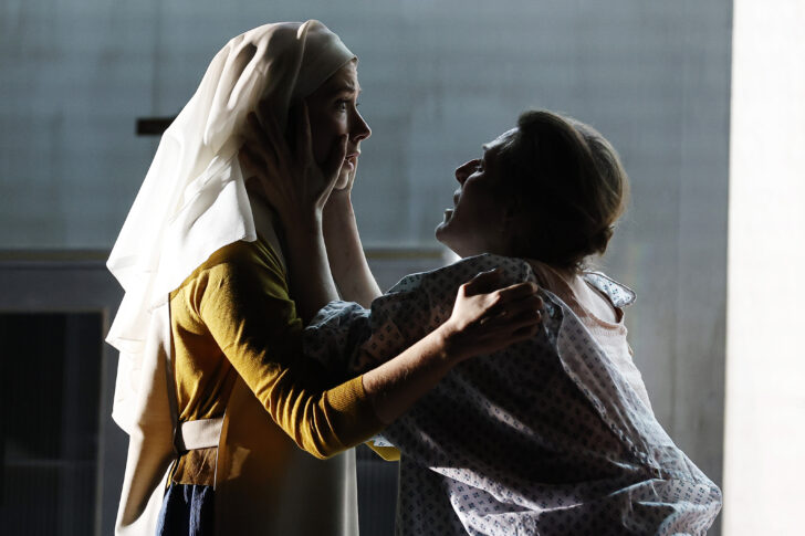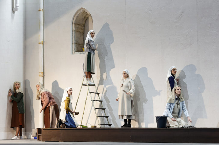 Rouen. Théâtre des Arts. 30-I-2025. Francis Poulenc (1899-1963) : Le Dialogue des Carmélites (1957) opéra en 3 actes sur un livret de Georges Bernanos d’après la nouvelle de Gertrude Von Le Fort. Mise en scène : Tiphaine Raffier. Scénographie : Hélène Jourdan. Costumes : Caroline Tavernier. Lumières : Kelig Le Bars. Vidéo : Nicolas Morgan. Avec : Hélène Carpentier, Blanche ; Lucile Richardot, Madame de Croissy ; Axelle Fanyo, Madame Lidoine ; Eugénie Joneau, Mère Marie ; Emy Gazeilles, Sœur Constance ; Aurélia Legay, Mère Jeanne ; Alice Gregorio, Sœur Mathilde ; Jean-Fernand Setti, Le Marquis de la Force/Le Geolier ; Julien Henric, le Chevalier de La Force ; François Rougier, l’Aumonier ; Matthieu Justine, Premier Commissaire ; Jean-Luc Ballestra, Deuxième Commissaire ; Ronan Airault, Javelinot. Orchestre de l’opéra de Rouen/Normandie, Orchestre Régional de Normandie, Choeur Accentus/ Opéra de Rouen Normandie, direction : Ben Glassberg.