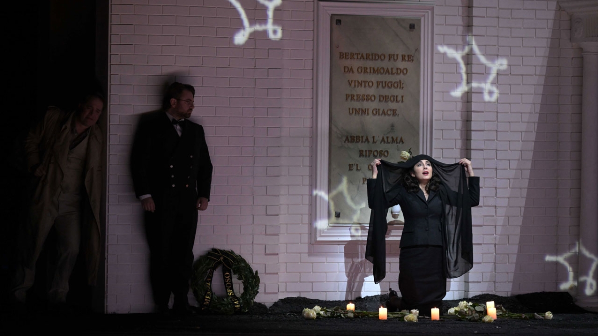 Bertarido est chanté par Lawrence Zazzo, certainement le plus beau timbre de contre-ténor de ces trente dernières années. On avait pu voir une certaine usure dans cette voix de miel il y a moins d'un an sur la même scène dans Giulio Cesare, mais le rôle est cette fois moins héroïque, et la poésie élégiaque a toujours été une force de Zazzo qui parvient souvent à émouvoir : son art de la phrase haendelienne est à nul autre pareil. Il trouve une partenaire à sa hauteur en la personne d'Elena Villalón : le timbre est juvénile, et la souplesse dont elle fait preuve lui permet de donner à son personnage une vie intérieure sans la confire dans son noble chagrin. Le duo de conseillers opposés voit le triomphe du mal sur le bien : le vil Garibaldo (Božidar Smiljanić), dont le rôle est à vrai dire plus payant, ne fait qu'une bouchée du vertueux Unulfo (Rafał Tomkiewicz), dont la voix manque de fermeté. Dans l'autre couple, Josh Lovell en tyran complexé manque un peu de variété, si bien qu'on voit mieux sa faiblesse que sa cruauté ; Zanda Švēde, sans aller aussi loin dans l'ironie mordante que la merveilleuse Felicity Palmer dans le spectacle de David Alden, est beaucoup plus présente que son infidèle fiancé.